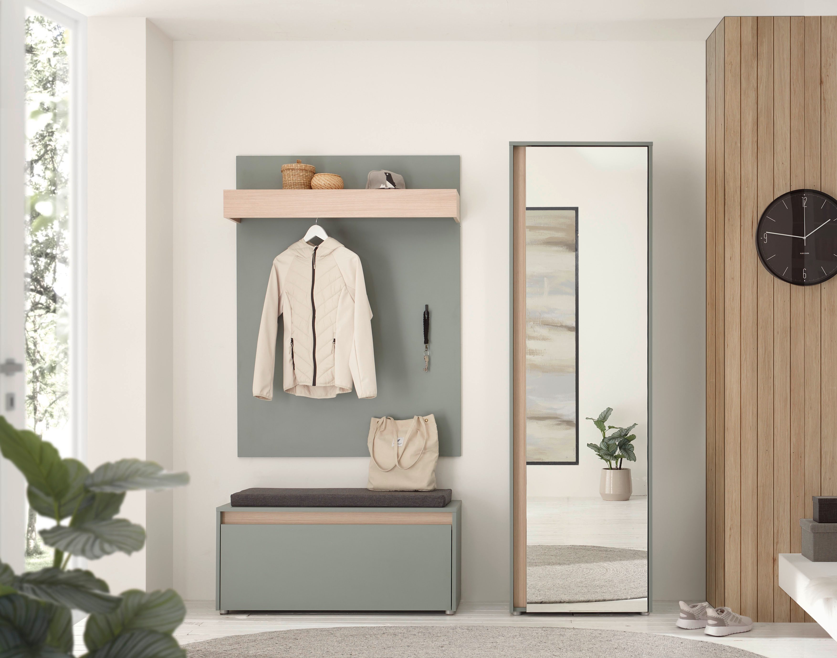 Set beinhaltet | 1 Garderobenschrank mit Spiegel, 1 Garderobenpaneel, 1 Garderobenbank inkl. Sitzkissen |