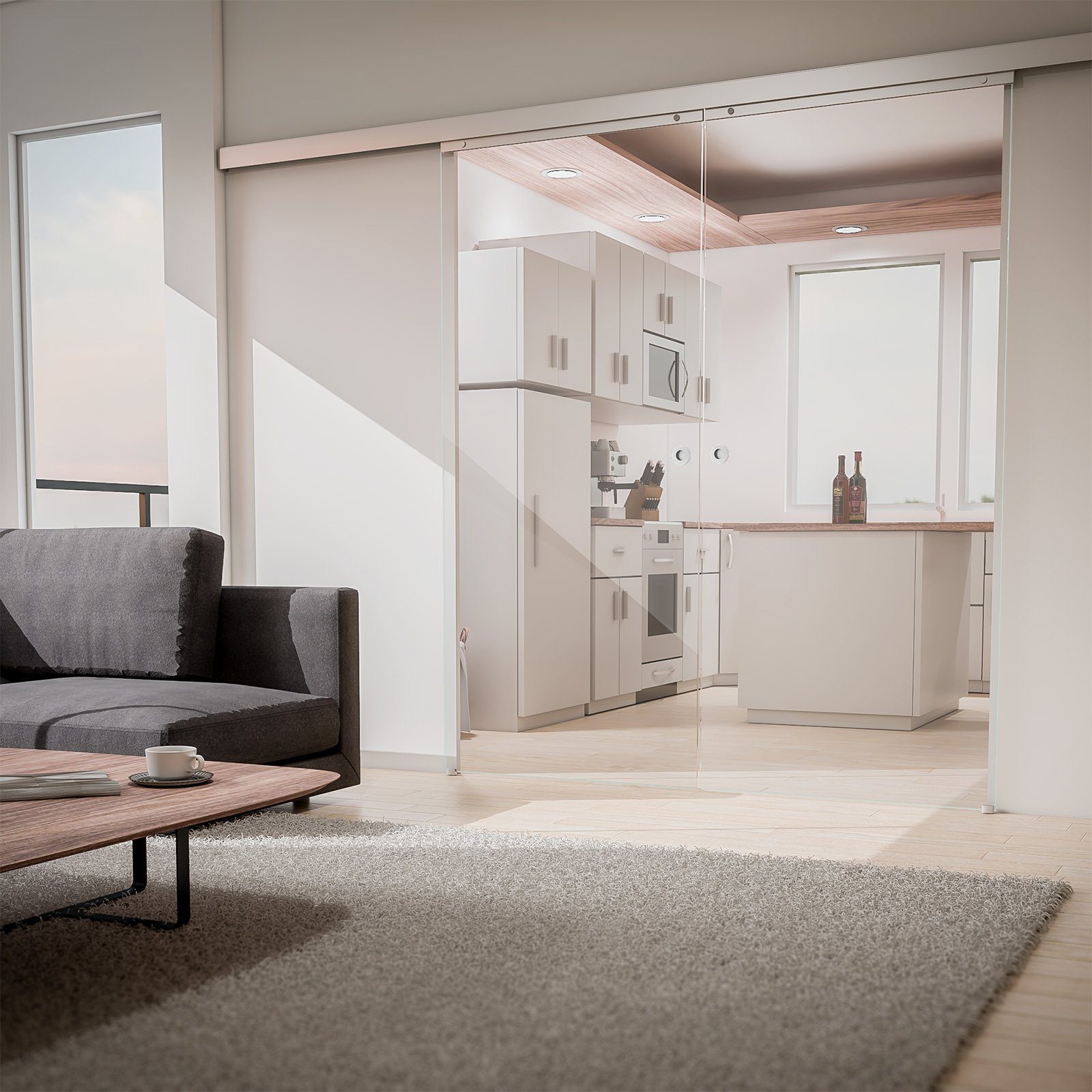 Das wartungsfreie Laufschienensystem mit kugelgelagerten Laufwagen garantiert leises Gleiten und verhindert störendes Pendeln dank Bodenführung. Optional sorgt ein Softclose-System für sanftes Спрятать der Türen.