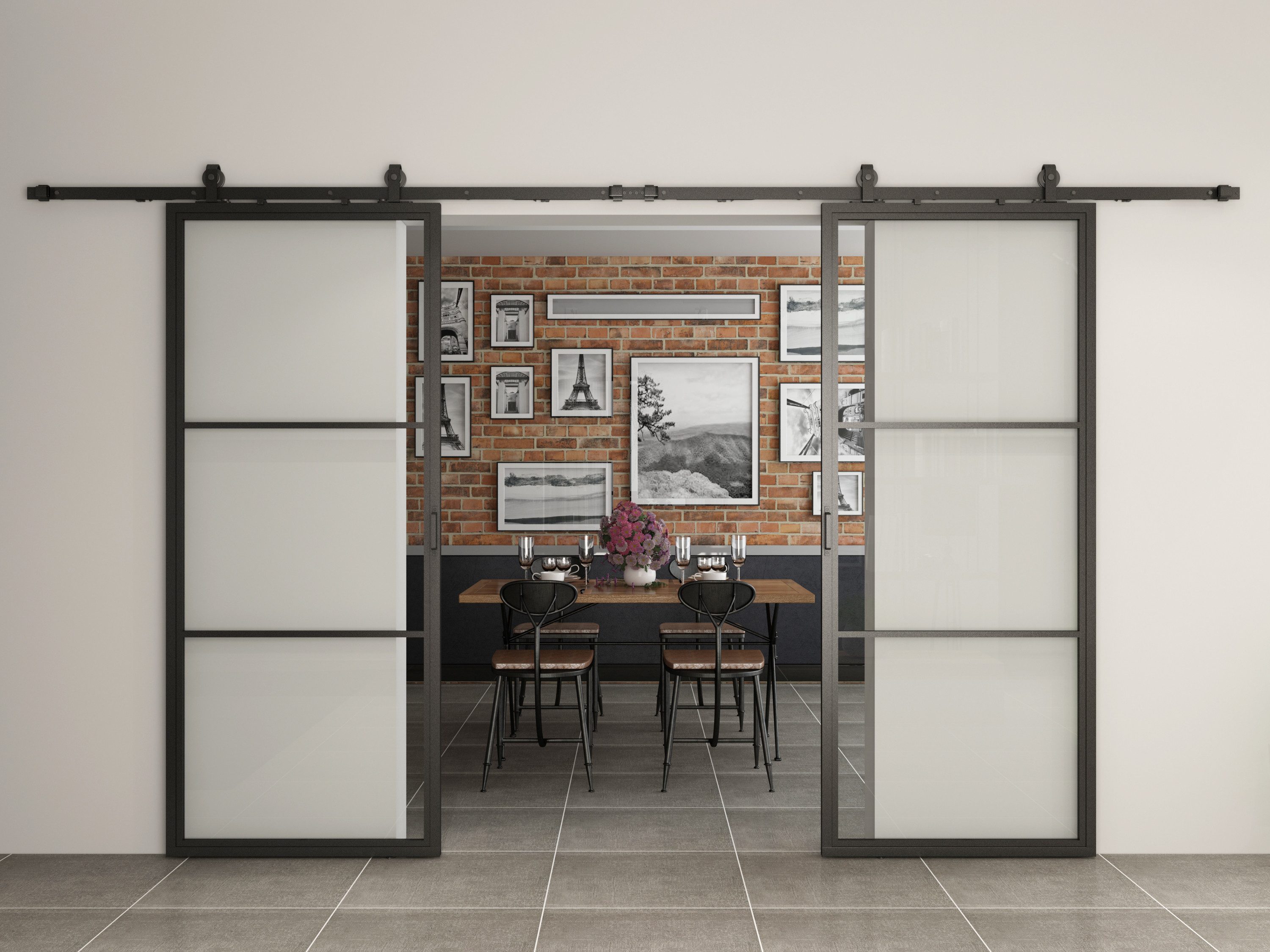 Dieses Schiebetür-System besteht aus 4 mm starkem Klarglas mit einem 32 mm breitem, umlaufendem Stahlprofil. Die Laufschiene ist aus Stahl gefertigt. Die wartungsfrei kugelgelagerten Laufwagen sorgen für äußerste Laufruhe – auch nach vielen Jahren intensiver Nutzung. Der Bodenführungsstift verhindert Pendelbewegungen.