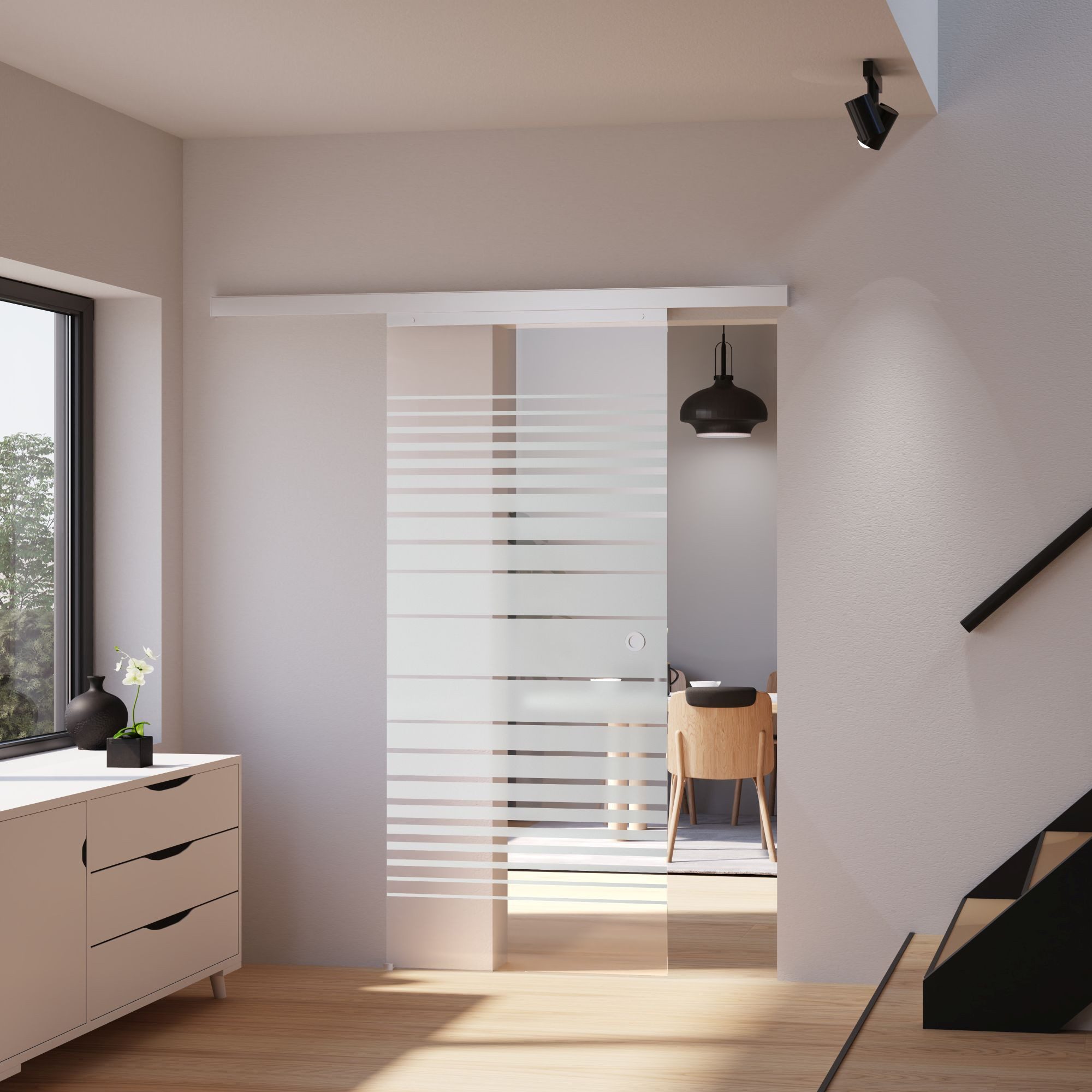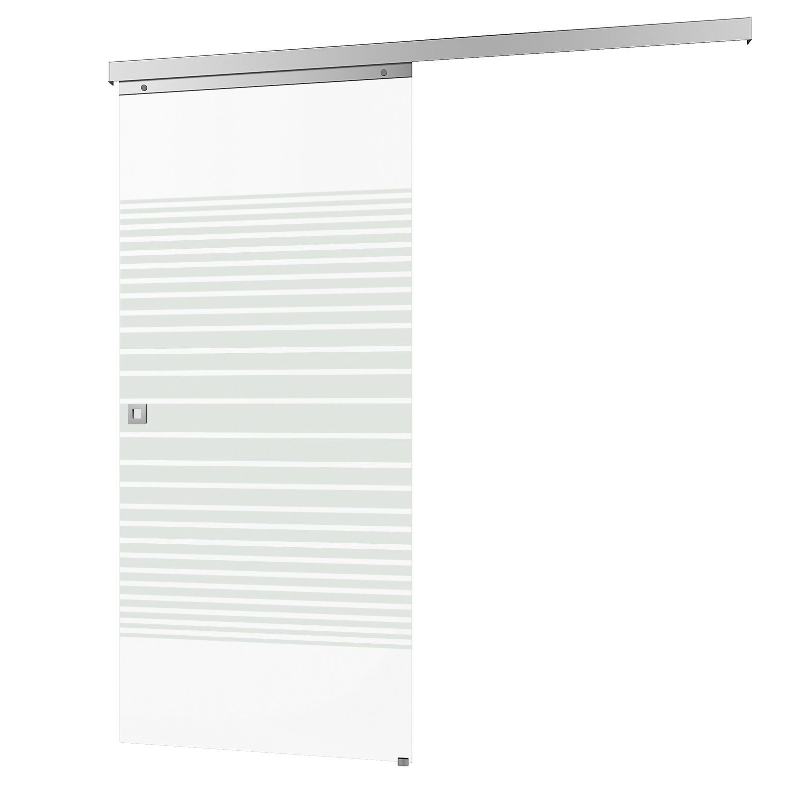Das Schiebesystem besteht aus 8 mm Sicherheitsglas mit Dekor "Streifen". Die Beschläge und Profile sind aus hochwertigem Aluminium gefertigt. Wartungsfrei kugelgelagerte Laufwagen sorgen für äußerste Laufruhe - auch nach vielen Jahren intensiver Nutzung. Durch die beiliegenden Positionsstopper wird ein hartes Anschlagen der Türflügel verhindert. Das Türblatt kann je nach Positionierung des Stoppers bis zum Ende der Laufschiene fahren. Der Bodenführungsstift vermeidet Pendelbewegungen.