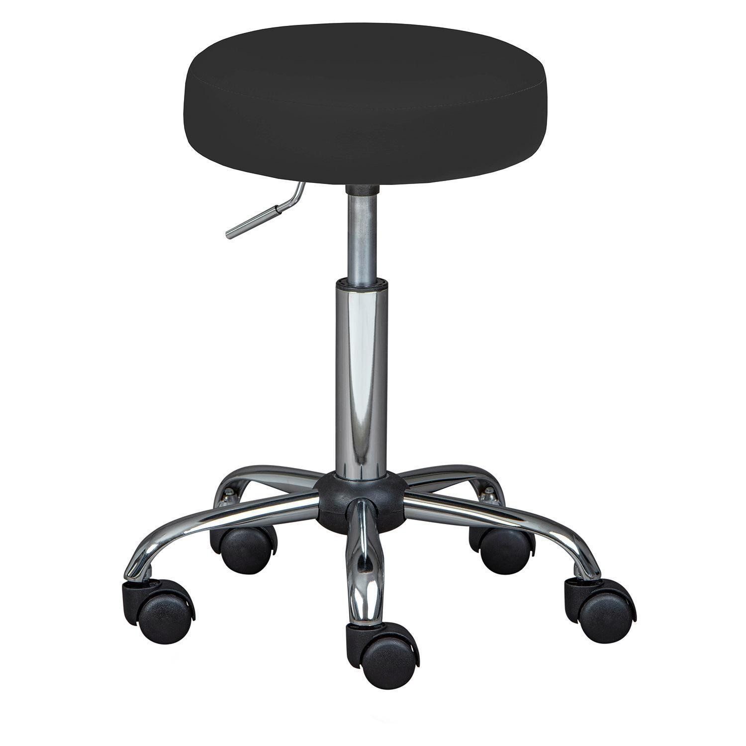 Der Drehhocker ASRA ist mit einem schwarzen Kunstlederbezug ausgestattet und verfügt über ein Gestell aus Metall in Chromfarben. Die Sitzhöhe kann mithilfe eines Gaslifts stufenlos von 52 cm bis 66 cm verstellt werden. Der Hocker ist mit fünf gebremsten Sicherheitsrollen versehen, die für einen sicheren Stand und flexible Beweglichkeit sorgen. Der Sitz hat einen Durchmesser von 35 cm und die Gesamthöhe beträgt 52 cm.