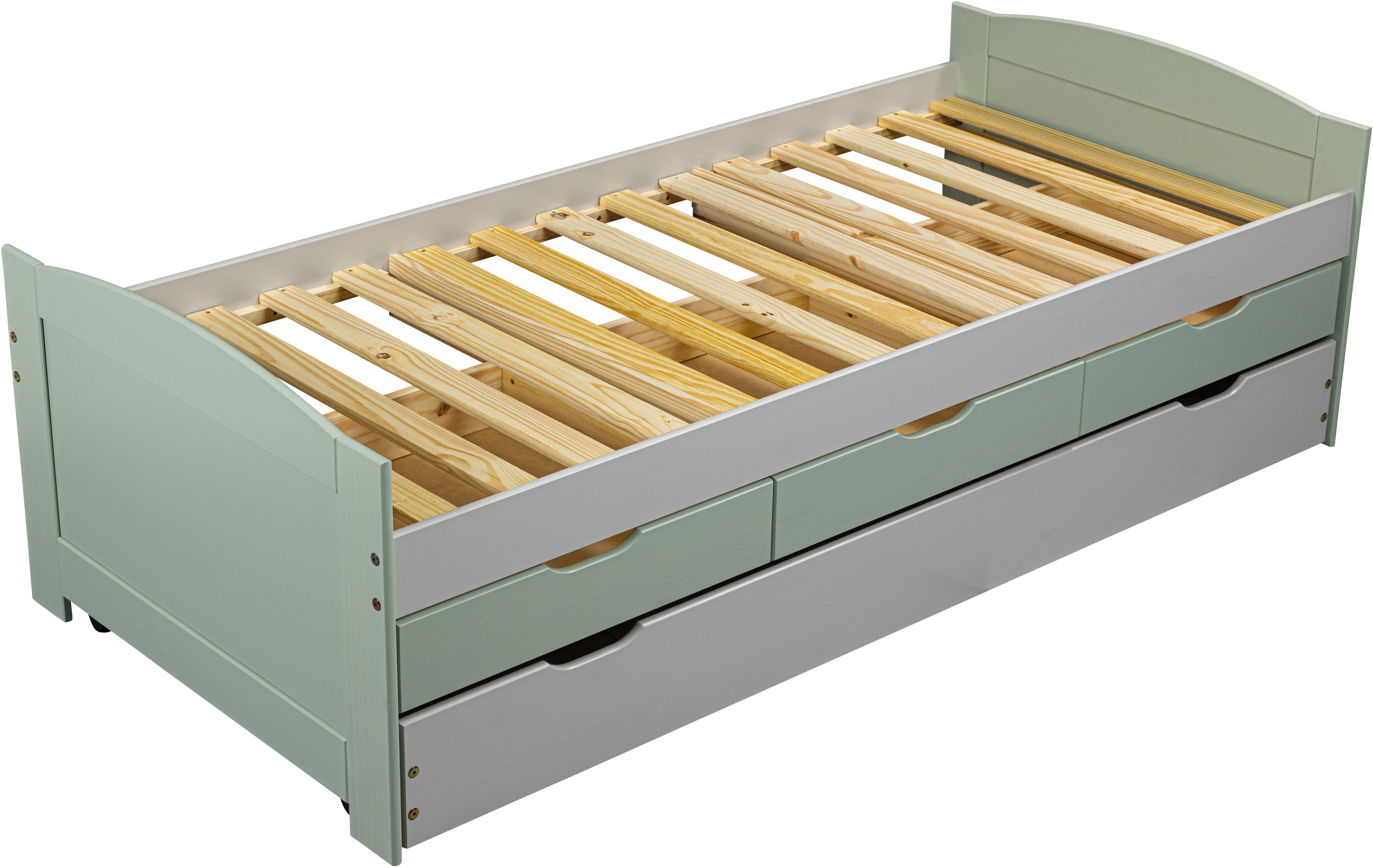 Hinweis Ausstattung | 1 Ausziehbett auf Rollen mit einer Bodenplatte 1 Bettgestell mit Lattenrost 3 Schubladen |