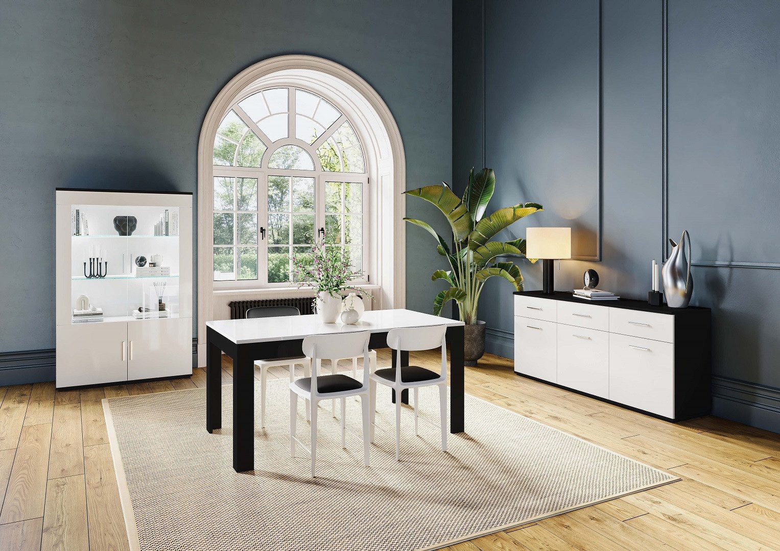 Set beinhaltet | 1x Vitrine 4-Türig, 1x Sideboard, 1x Esstisch |