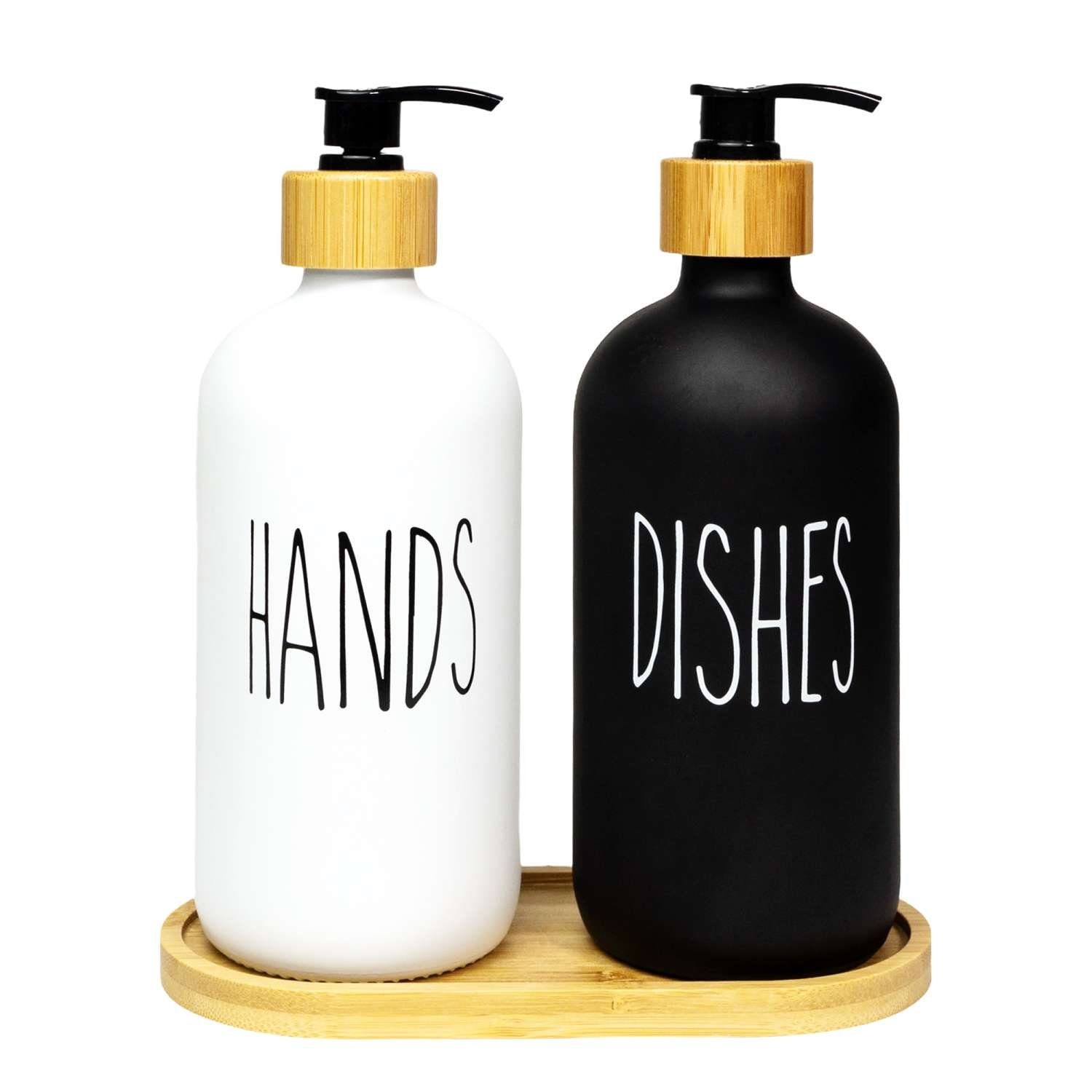 Dieses Set enthält zwei Pumpflaschen, die jeweils für einen speziellen Zweck entwickelt wurden. Eine Flasche ist als Handseifenspender mit der Aufschrift "Hands" beschriftet, während die andere als Spülmittelspender mit der Aufschrift "Dishes" gekennzeichnet ist. So wird die Verwendung noch einfacher und intuitiver.