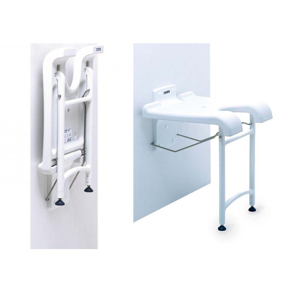 Der Duschklappsitz Sansibar kann bei nichtgebrauch einfach an die Wand hochgeklappt werden. Er besitzt einen großen Hygieneausschnitt und ein Ausgleich von eventuellen Bodenunebenheiten erfolgt durch feinjustierbare Füße.