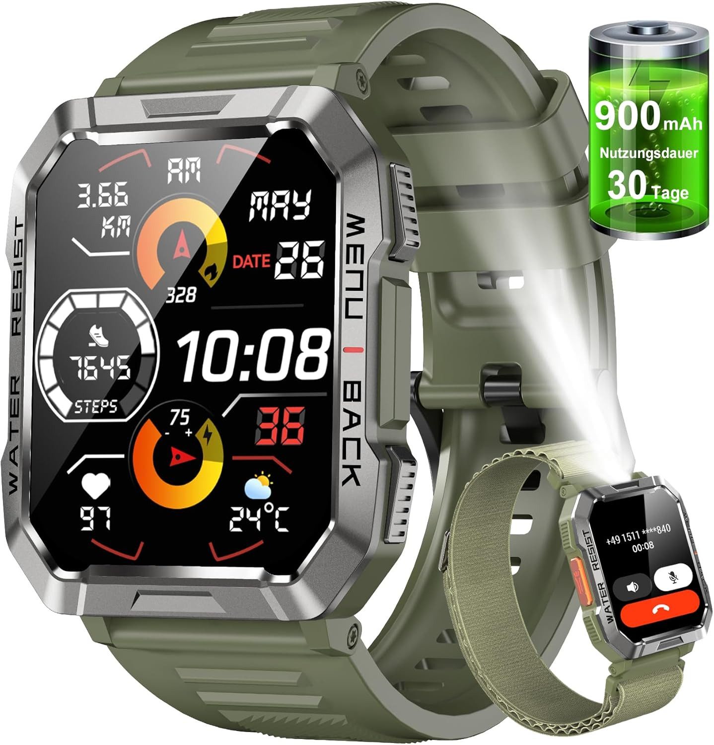 Die taktische Herren-Fitnessuhr wurde speziell für Nutzer entwickelt, die höchste Ansprüche an Robustheit, Akkulaufzeit und Funktionsvielfalt stellen. Sie eignet sich perfekt für Sport, Outdoor-Aktivitäten und den täglichen Einsatz – ob im Gelände, auf Reisen oder im Berufsalltag. Mit ihrer militärisch getesteten Bauweise, einem extrem leistungsstarken Akku und zahlreichen intelligenten Funktionen setzt sie neue Maßstäbe im Bereich der Outdoor-Wearables.