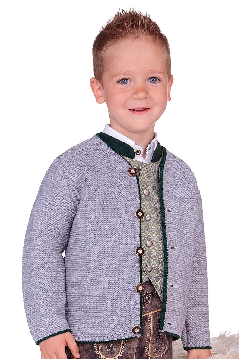 Mit dieser urigen Kreation aus dem Hause Isar-Trachten, eine schöne Trachten Strickjacke für Kinder namens Mats, ist der Nachwuchs so zünftig angezogen wie die Großen. Die tolle Trachtenjacke mit kuscheligem Schurwoll-Anteil hat allover ein fesches Strickmuster in Linksstrick-Art im schicken Melange-Look. Sowohl der Rundhals-Ausschnitt, die Knopf- und Knopflochleiste als auch der Saum sowie die Bündchen der Kinderstrickjacke sind im gerippten Rechtsstrick-Stil gestaltet und an den Außenrändern mit der Kontrastfarbe Dunkelgrün akzentuiert. Kernige Knöpfe in Hirschhorn-Optik schmücken die Knopfleiste. Die Rückseite ist mittig längs mit einer dezenten Teilungsnaht versehen und der Nackenbereich innenseitig angenehm mit Karo-Stoff gefüttert. Diese Strickjacke für Jungen passt prima zu Trachtenjeans und Lederhose.
