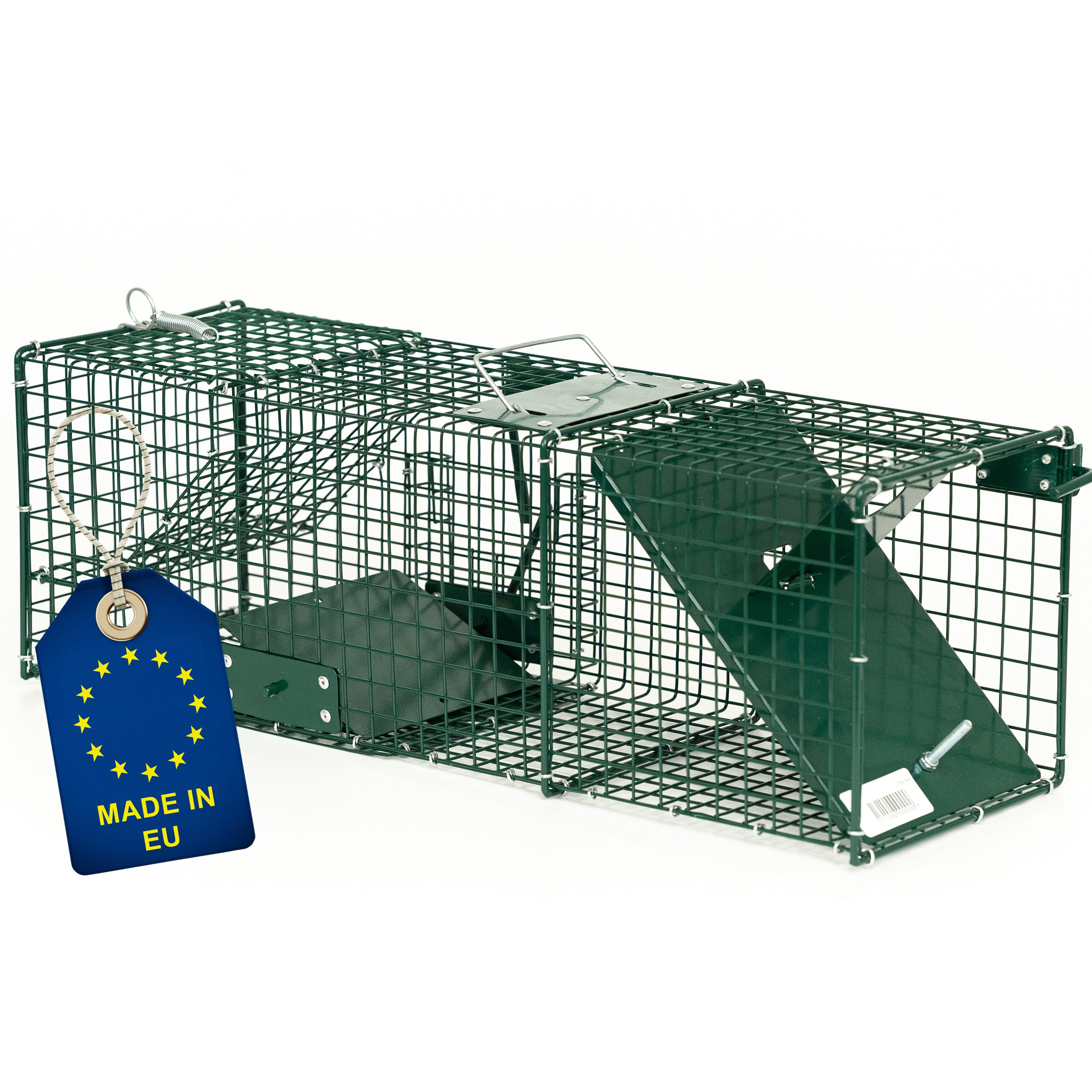 Die grüne Farbgebung (RAL 6005) sorgt für perfekte Tarnung in Ihrem Garten oder auf Ihrem Grundstück, während der Ködermechanismus über einen sensiblen Haken aktiviert wird, das eine zuverlässige Fangmethode darstellt. Die Konstruktion mit 1 Eingang und einer Gitternetz-Weite von 19 x 19 mm bei einer Stärke von 1,5 mm ermöglicht einen humanen und zuverlässigen Fang.