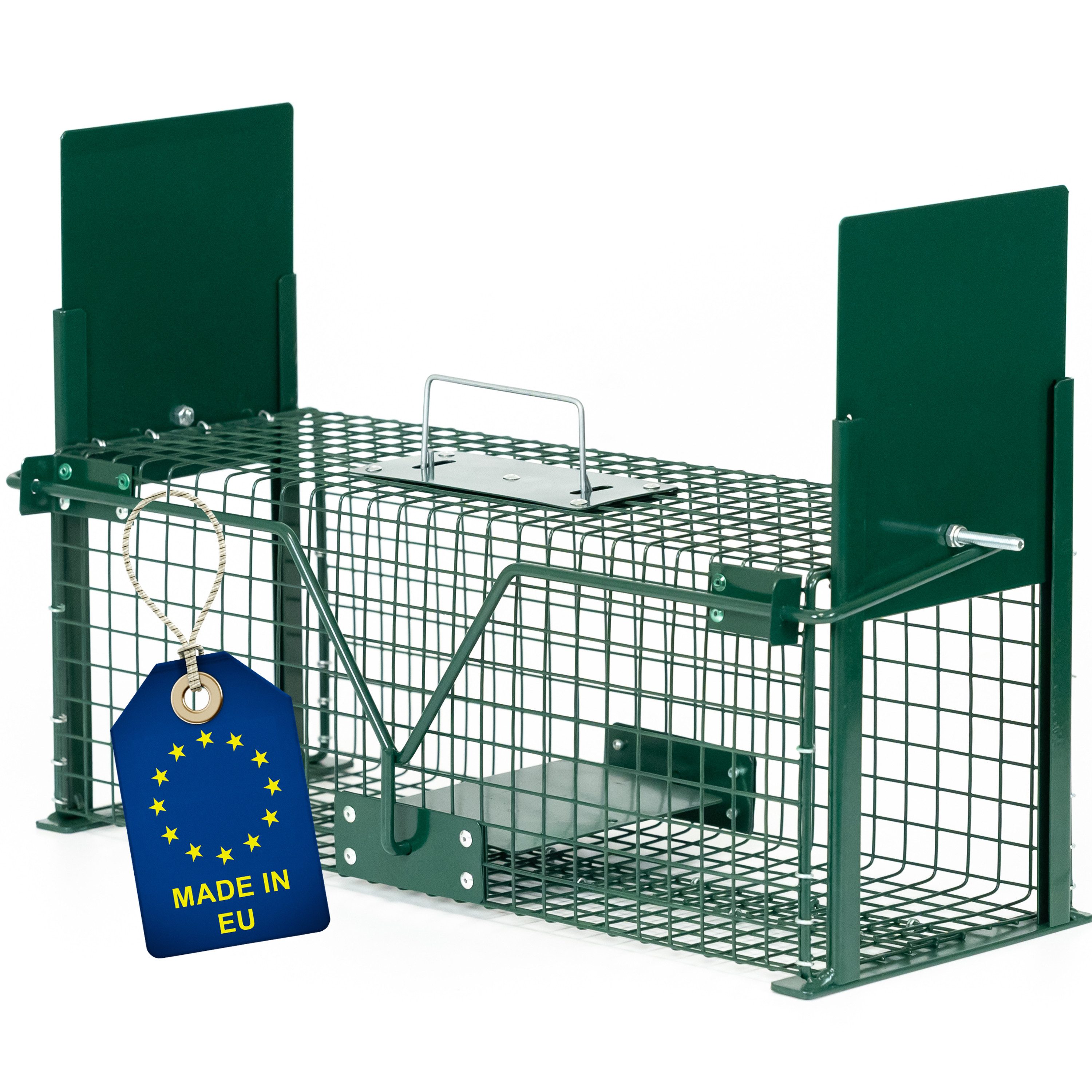 Die grüne Farbgebung (RAL 6005) sorgt für perfekte Tarnung in Ihrem Garten oder auf Ihrem Grundstück, während der Ködermechanismus über ein sensibles Trittbrett aktiviert wird, das eine zuverlässige Fangmethode darstellt. Die Konstruktion mit zwei Eingängen und einer Gitternetz-Weite von 19 x 19 mm bei einer Stärke von 1,5 mm ermöglicht einen humanen und zuverlässigen Fang.