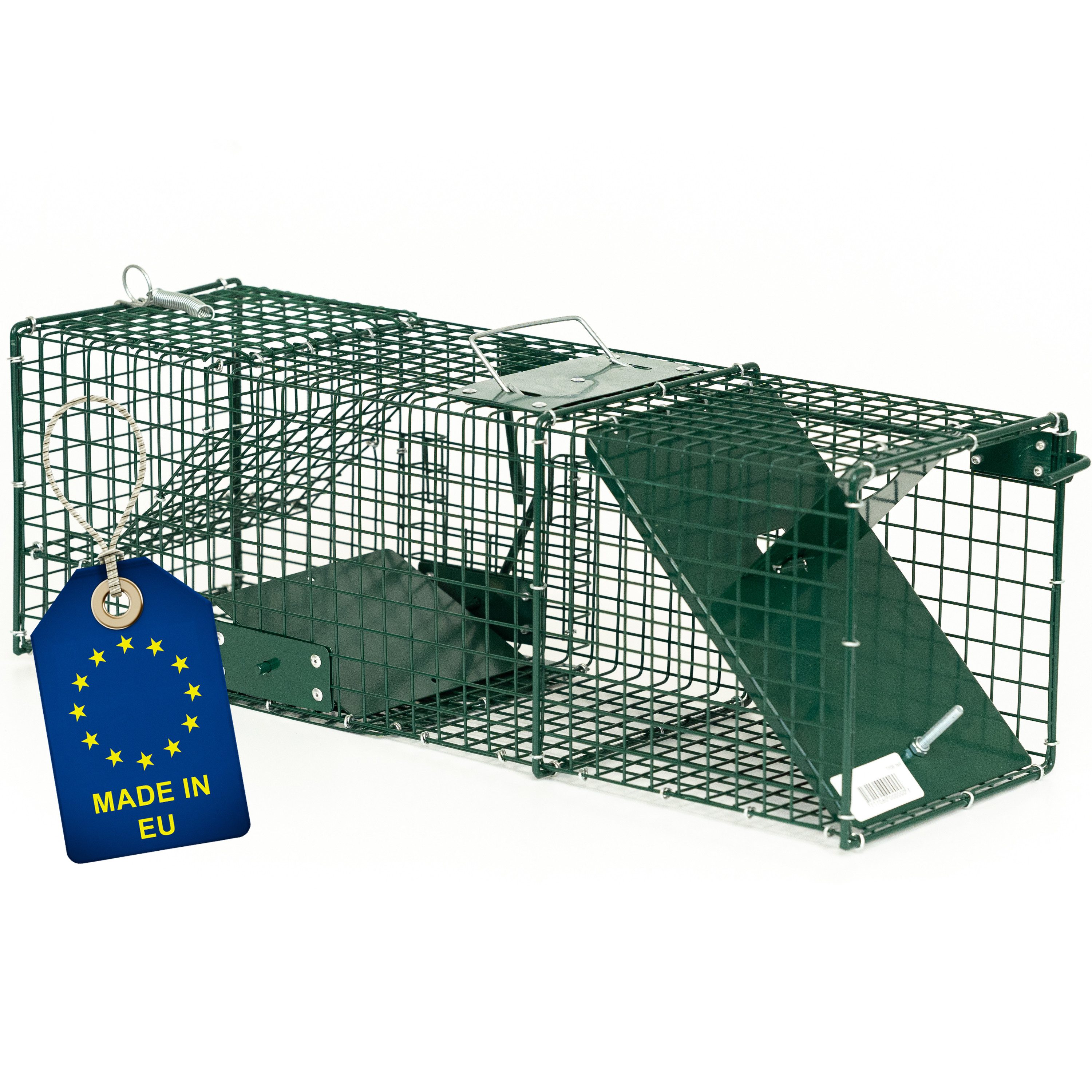Die grüne Farbgebung (RAL 6005) sorgt für perfekte Tarnung in Ihrem Garten oder auf Ihrem Grundstück, während der Ködermechanismus über ein sensibles Trittbrett aktiviert wird, das eine zuverlässige Fangmethode darstellt. Die Konstruktion mit 1 Eingang und einer Gitternetz-Weite von 19 x 19 mm bei einer Stärke von 1,5 mm ermöglicht einen humanen und zuverlässigen Fang.