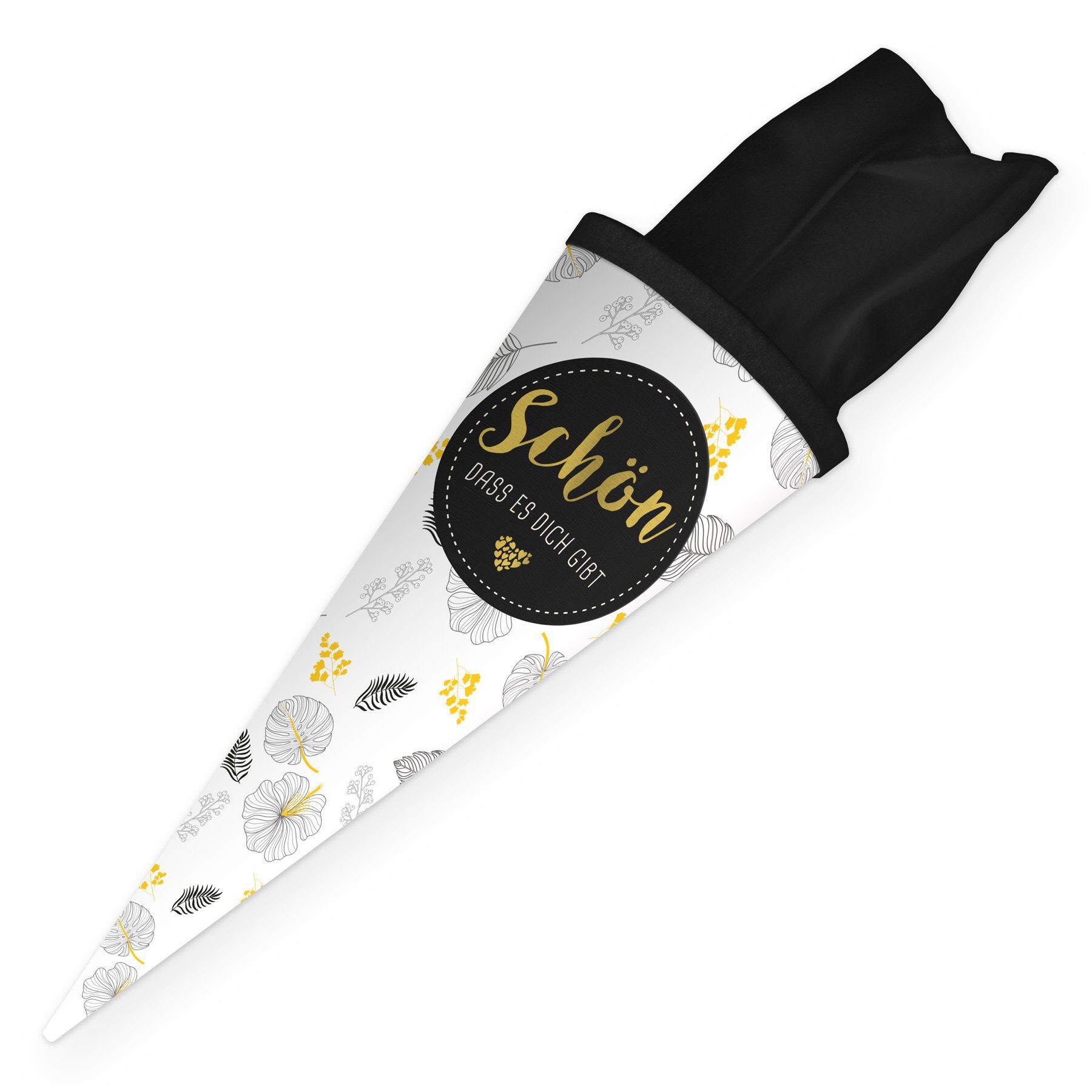- Schultüte mit Filzverschluss - Größe: 35 cm - 250 gr. Karton - Motiv: Abstraktes Muster mit Pflanzen und Blättern in schwarz und goldgelb - Farbe Filzverschluss: schwarz - schickes Design, auch ideal als Geschenkverpackung geeignet - mit schwarzem Aufkleber SCHÖN DASS ES DICH GIBT auf edlem Strukturpapier, 9,5 cm Durchmesser - Text teilweise in hochglänzender Goldfolie