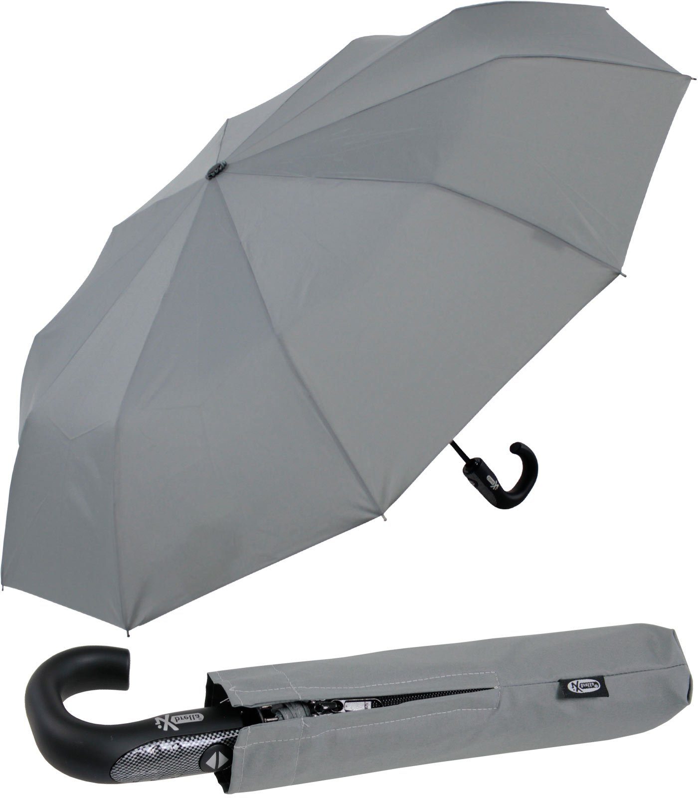Dieser klassische und robuste Taschenschirm besitzt ein stabiles, sturmfestes Stahl-Fiberglas-Gestell mit 10 Streben und einer zuverlässigen, kräftigen Auf-Zu-Automatik. Er gehört damit zu den sehr stabilen Regenschirmen. Dieser Automatikschirm für den Herren besitzt ein besonders großes Dach mit einem Durchmesser von ca. 106 cm und schützt damit auch große Männer zuverlässig. Der Bezug ist mit Teflon beschichtet, damit Regentropfen und Schmutz leicht abperlen und der Schirm sehr schnell trocknet und stets sauber bleibt. Впередhin ist er windfest und überschlagssicher. Das bedeutet, dass der Schirm, sollte er bei starkem Wind überschlagen, nach einfachem Спрятать und Öffnen wieder einsatzbereit ist, ohne beschädigt worden zu sein.