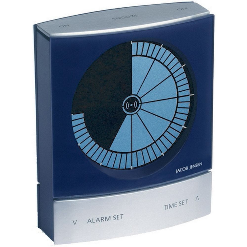 Jacob Jensen hat einen in Funktion und Design raffinierten Quarz Wecker entworfen. Der Wecker hat keine Zeiger und keine Zahlen. Die Zeit wird in leicht verständlichen Segmenten dargestellt, ein im Sekunden Takt blinkender Kreis im Innern der Anzeige versinnbildlicht die laufende Zeit. Die Stunden werden im großen inneren Kreis in einer Aufteilung von 12 Segmenten gezeigt, jedes der Segmente steht für eine volle Stunde. Die Minuten erscheinen im äußeren Kreis in der gewohnten 60 Minuten Aufteilung. Der Quarz Wecker hat eine Weckzeit mit akustischem Alarm, eine Snooze-Funktion und, praktisch im Reiseeinsatz, eine Tastensperre. Ein starkes blaues Hintergrundlicht ist per Tastendruck aktivierbar. Die Abbildungen zeigen sieben Stunden und 45 Minuten; somit ist die aktuell gezeigte Zeit 07.45 oder 19.45.