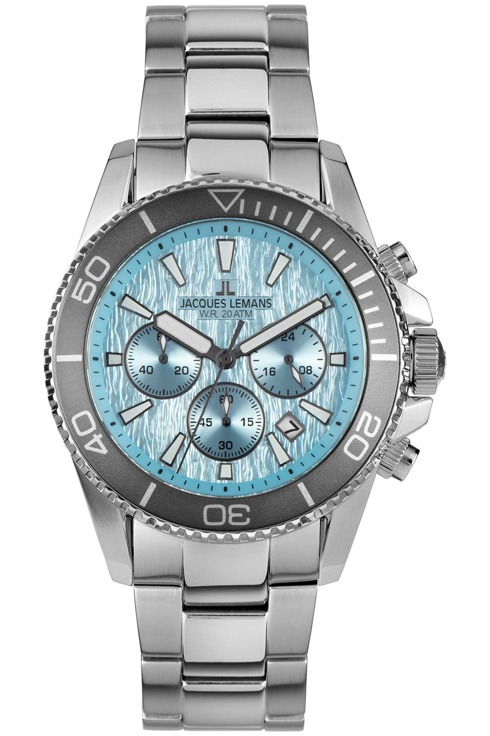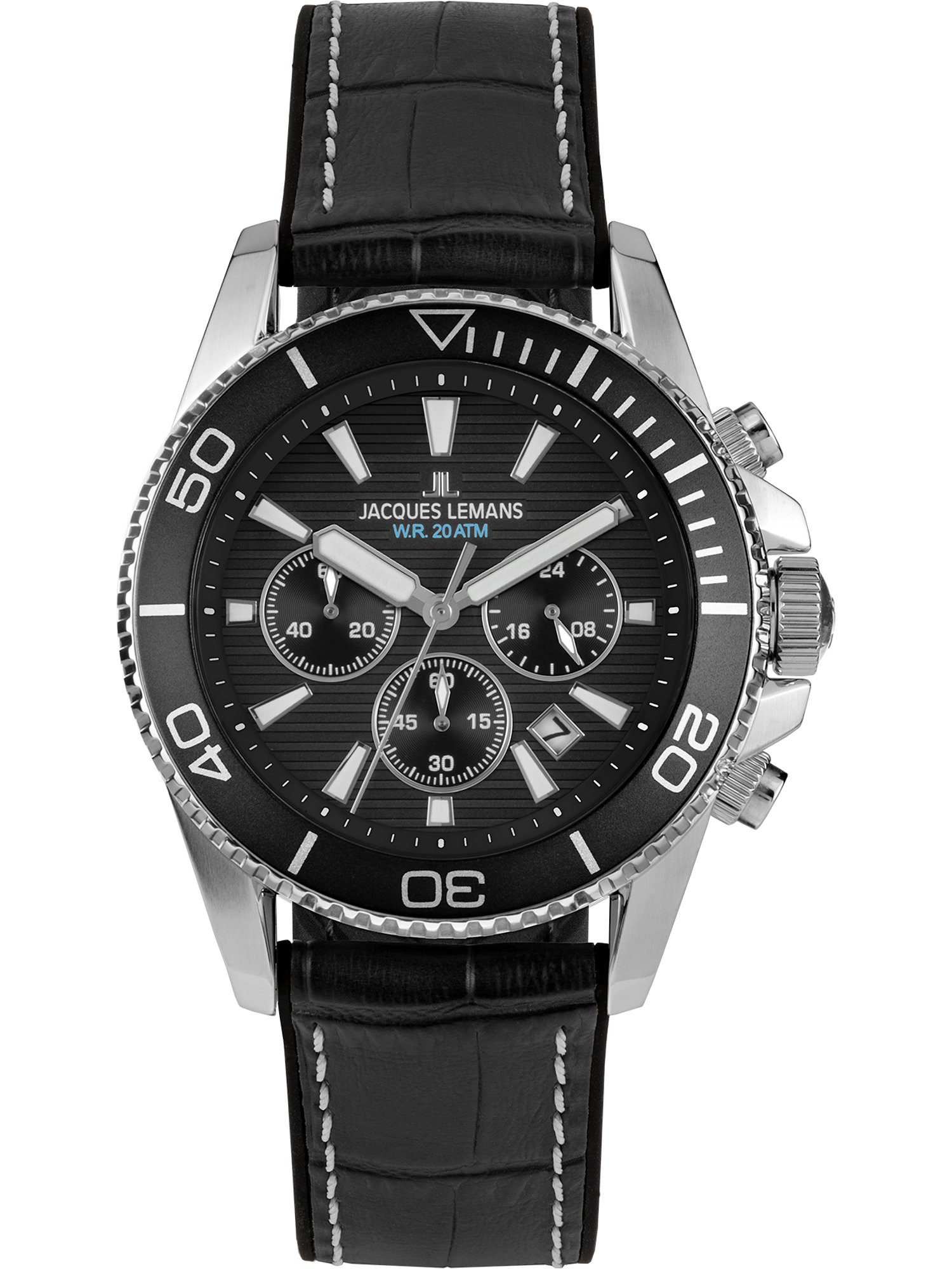 Jacques Lemans schafft Uhren, die dich ein Leben lang begleiten – durch präzise Handwerkskunst und ein Auge für edles Design. Entdecke einen Zeitmesser, der mehr ist als ein Accessoire und den Moment für dich einfängt. Die Jacques Lemans Liverpool Diver ist die perfekte Uhr für Männer, die bei Stil und Qualität keine Kompromisse machen wollen. Das Edelstahlgehäuse und das Lederband ergänzen sich zu einem Sportchronographen mit sportlichem Charakter. Funktionalität in ihrer schönsten Form Der kühle Glanz mit dem runden Gehäuse ist immer eine stilsichere und edle Wahl. Über allem liegt ein schützendes Crystexglas. Typisch für einen Chronographen mit Hilfszifferblättern zeigt auch diese Jacques Lemans die Komplikationen Totalisatoren sowie eine Stoppfunktion. Das schwarze Leder-Band verleiht der Uhr eine edle Note und die Dornschließe sorgt für einen sicheren Halt am Handgelenk. Durch die Leuchtzeiger und Leuchtindizes ist beste Ablesbarkeit auch im Dunklen oder bei schlechtem Licht jederzeit garantiert. Der betont sportliche Look wird durch die drehbare Lünette unterstrichen. Die integrierte Datumsanzeige ermöglicht es, jederzeit das aktuelle Datum schnell und einfach abzulesen. Die Jacques Lemans-Uhr besticht nicht nur durch ihr Quarz-Werk, welches für höchste Präzision sorgt, sondern auch durch ihre Funktionalität: Sie ist bis zu 20bar wasserdicht und somit perfekt geeignet für Ausflüge ans Wasser. Всеs in allem ist dieser Zeitmesser von Jacques Lemans ein sportlicher, legerer Begleiter, der dein Outfit perfekt ergänzt.