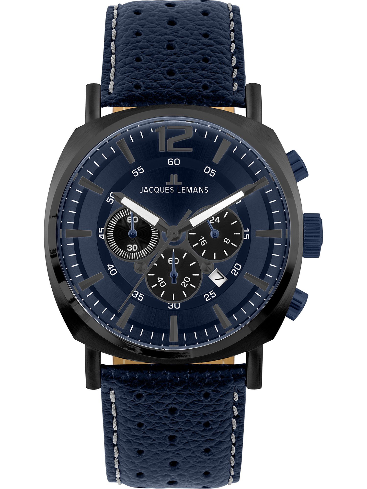 Jacques Lemans steht für Uhren, die in Design und Qualität deine Ansprüche erfüllen. Von eleganten Klassikern bis hin zu sportlichen Modellen – hier findest du Stil, der nie aus der Mode kommt. Für alle, die einen bleibenden Eindruck hinterlassen wollen. Das Armband und das Ziffernblatt der Jacques Lemans Lugano überzeugen in schickem Dunkelblau, das schwarze Gehäuse und die schwarze Lünette verleihen der Farbgebung den letzten Schliff. Das runde Gehäuse strahlt eine hohe Eleganz und Stilsicherheit aus. Geschützt wird das Ziffernblatt von einem robusten Crystexglas. Typisch für einen Chronographen mit Hilfszifferblättern zeigt auch diese Jacques Lemans die Komplikationen Totalisatoren und eine Stoppfunktion. Das Leder-Band wird mit einer Dornschließe sicher am Handgelenk fixiert. Beste Ablesbarkeit auch bei Dunkelheit oder schlechtem Licht ermöglichen die Leuchtzeiger. Ein nützliches Feature ist die Datumsanzeige, die mit einem Blick das aktuelle Tagesdatum verrät. Nicht nur optisch ein Hingucker, sondern auch funktional überzeugend: Die Jacques Lemans-Uhr ist bis zu 10bar wasserdicht und dank des hochwertigen Quarz-Werks von Time Modul äußerst präzise. Diese sportliche Uhr von Jacques Lemans ist der ideale Partner für aktive Tage und verleiht jedem Outfit eine dynamische Note.