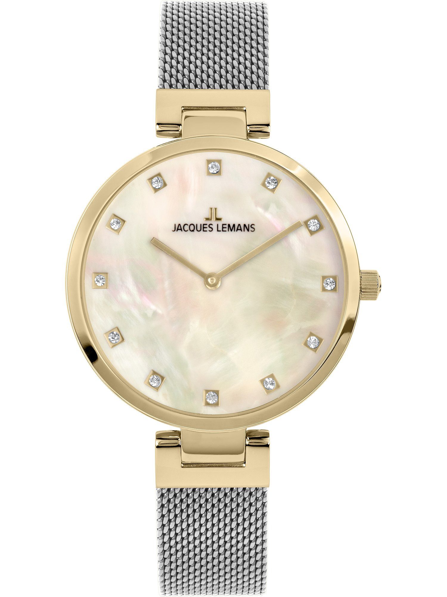 Jede Jacques Lemans Uhr ist ein Zeichen von Leidenschaft und Handwerkskunst. Die Marke verbindet technische Raffinesse mit klassischem Design und bringt dir Zeitmesser, die Stil und Beständigkeit vereinen. Für alle, die ihre Zeit bewusst leben. Zeitlose Eleganz trifft auf moderne Ästhetik Ein sportlich-eleganter Klassiker ist diese Damenuhr mit Edelstahl-Gehäuse an einem unkomplizierten Edelstahl-Band. Das Armband der Jacques Lemans Milano mit goldenem Gehäuse ist silbern, die goldene Lünette und das perlmuttfarbene Ziffernblatt vollenden die gelungene Farbgestaltung. Für eine Extra-Dosis Glamour sorgen 12 glitzernde Glassteine. Die runde Form des Gehäuses mit einem Durchmesser von 36 Millimetern trägt sich dezent am Handgelenk. Ein Quarzwerk garantiert höchste Präzision. Robuste Schönheit für jeden Tag Du kannst dich auf diesen Zeitmesser immer verlassen: Er ist bis zu 50 Meter (5 Bar) wasserdicht und hält damit den Belastungen beim Händewaschen und Baden stand. Durch die Klappschließe lässt sich das Armband leicht anlegen und sicher verschließen. Kurz gesagt: Die Jacques Lemans Milano Damenuhr ist ein Statement für guten Geschmack - und ein zuverlässiger Begleiter im Alltag.