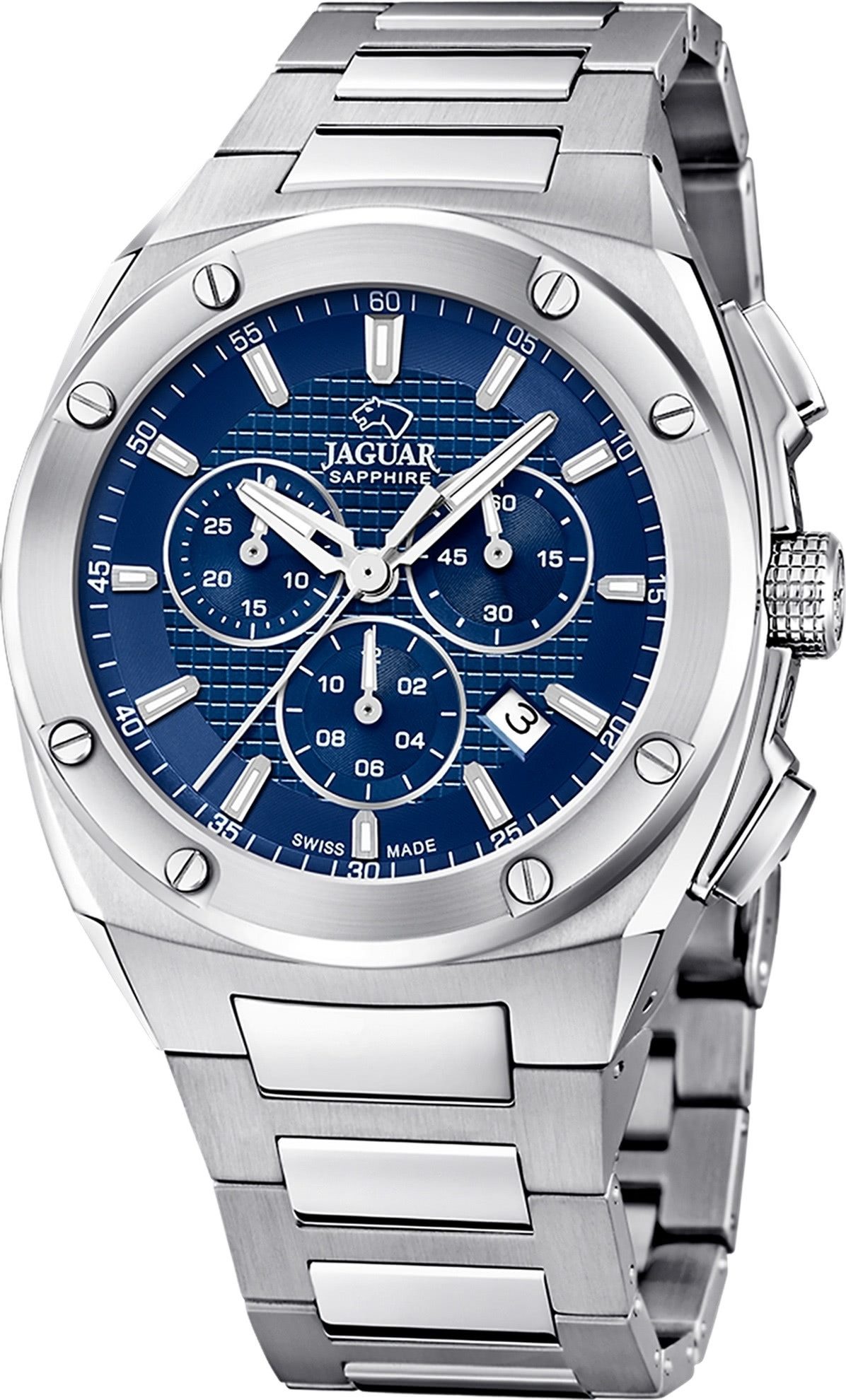 Die Elegant Luxus Uhr der Marke Jaguar hat ein schönes Armband aus Edelstahl in silber mit Faltschließe. Eine Uhr aus der Jaguar Executive Kollektion für Herren in der Gehäusefarbe silber mit Quarzwerk. Die Chronographuhr mit Saphirglas hat ein Zifferblatt in der Farbe blau. Die Form der Uhr ist rund und das Gehäuse ist extra groß ca. 45,5mm.