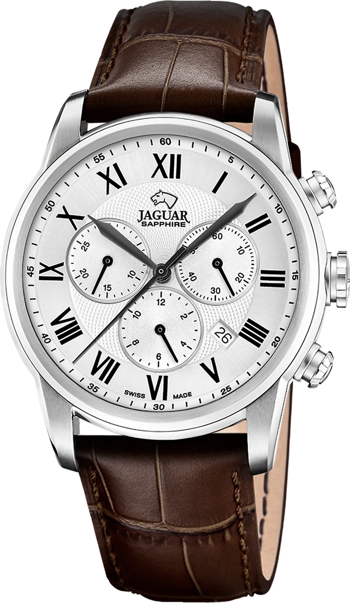 Die Elegant Luxus Uhr der Marke Jaguar hat ein schönes Armband aus Leder in braun mit Dornschließe. Eine Uhr aus der Jaguar Acamar Kollektion für Herren in der Gehäusefarbe silber mit Quarzwerk. Die Chronographuhr mit Saphirglas hat ein Zifferblatt in der Farbe silber. Die Form der Uhr ist rund und das Gehäuse ist groß ca. 42mm.
