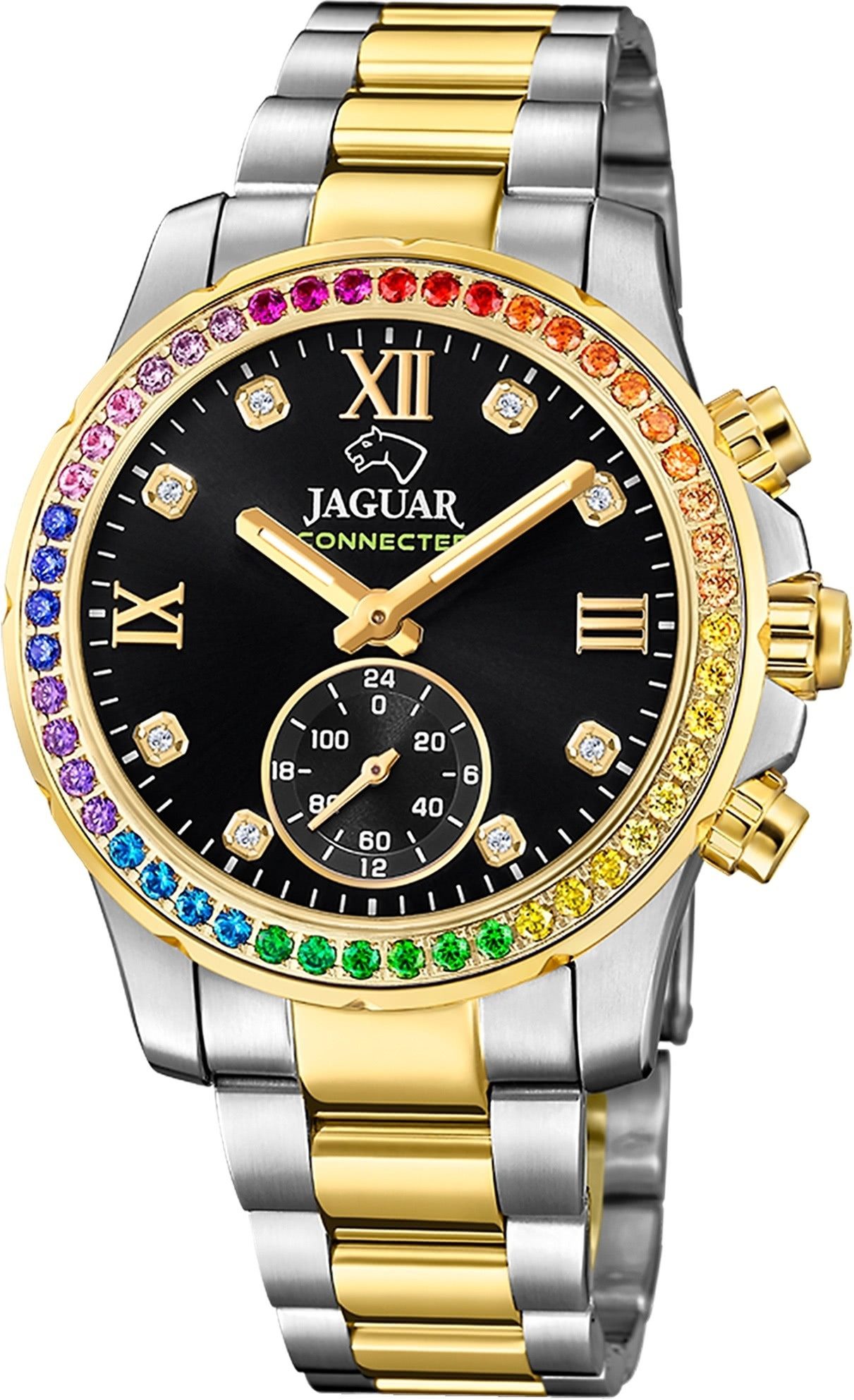 Die Sport Elegant Uhr der Marke Jaguar hat ein schönes Armband aus Edelstahl in silber gold mit Klappverschluss. Eine Uhr aus der Jaguar Connected Kollektion für Damen in der Gehäusefarbe silber gold mit Hybrid. Die Multifunktionuhr mit Saphirglas hat ein Zifferblatt in der Farbe schwarz. Die Form der Uhr ist rund und das Gehäuse ist mittel ca. 36,5mm.