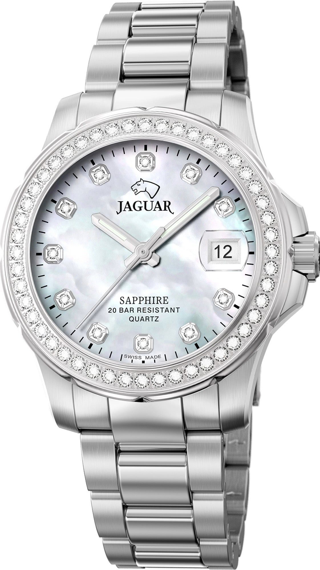 Diese schöne Uhr der Marke Jaguar hat ein Armband aus Edelstahl in silber mit Klappverschluss. Dieser besondere Zeitmesser für Damen aus der Jaguar Cosmopolitan Kollektion hat die Gehäusefarbe silber und ist mit einen Quarzwerk ausgestattet. Die Analoguhr mit Saphirglas hat ein Zifferblatt in der Farbe weiß perlmutt und die Gehäusegröße ist mittel ca. 34mm.