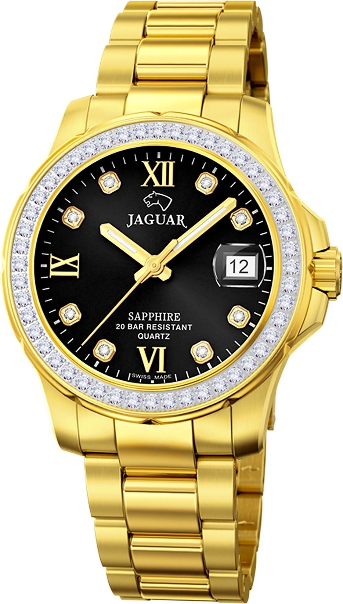 Die Luxus Uhr der Marke Jaguar hat ein schönes Armband aus Edelstahl in gold mit Faltschließe. Eine Uhr aus der Jaguar Executive Kollektion für Damen in der Gehäusefarbe gold mit Quarzwerk. Die Analoguhr mit Saphirglas hat ein Zifferblatt in der Farbe schwarz. Die Form der Uhr ist rund und das Gehäuse ist mittel ca. 34,5mm.