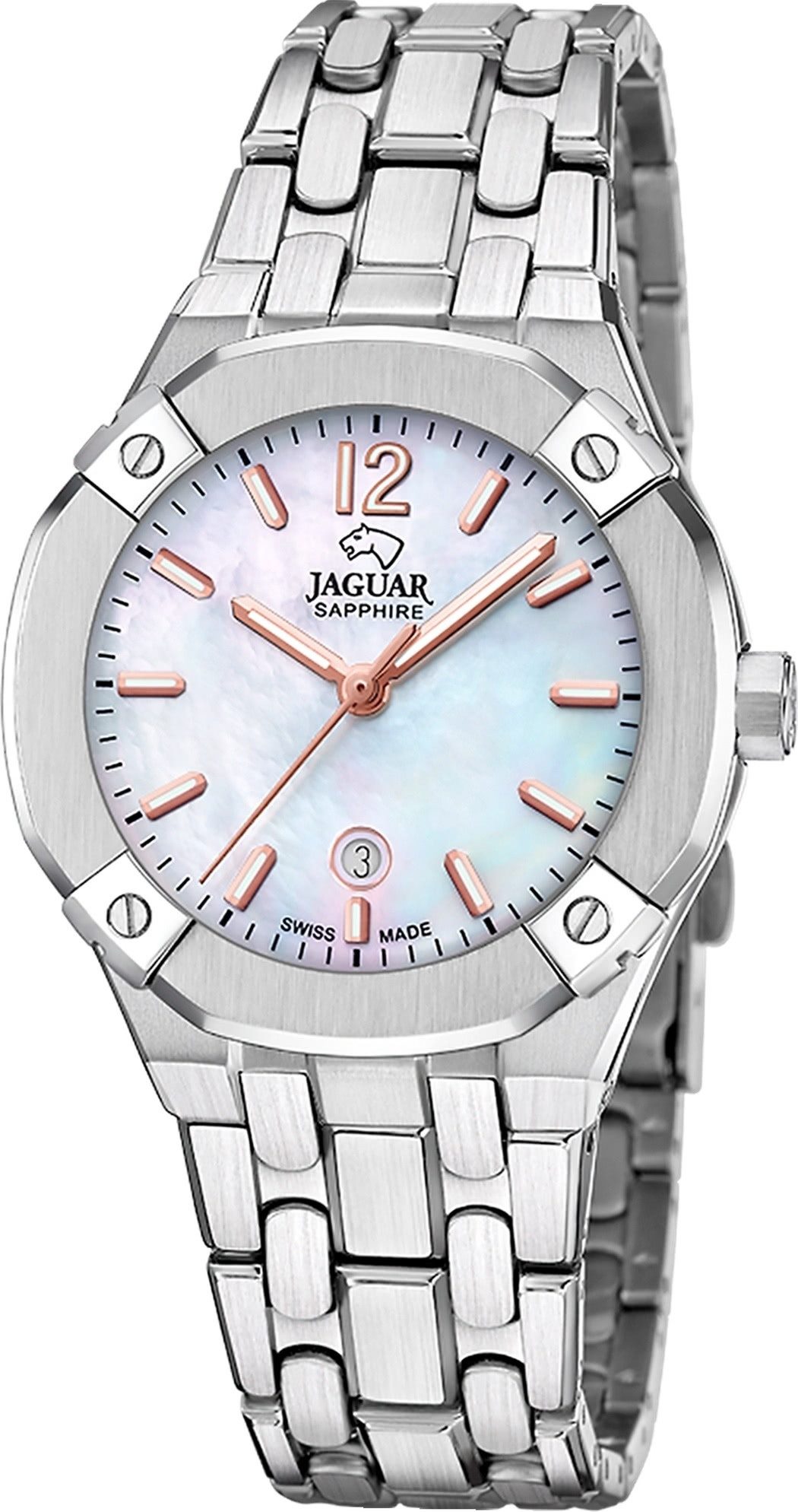 Die Luxus Uhr der Marke Jaguar hat ein schönes Armband aus Edelstahl in silber mit Klappverschluss. Eine Uhr aus der Jaguar Diplomatic Kollektion für Damen in der Gehäusefarbe silber mit . Die Analoguhr mit Saphirglas hat ein Zifferblatt in der Farbe weiß perlmutt. Die Form der Uhr ist rund und das Gehäuse ist mittel ca. 35,5mm.
