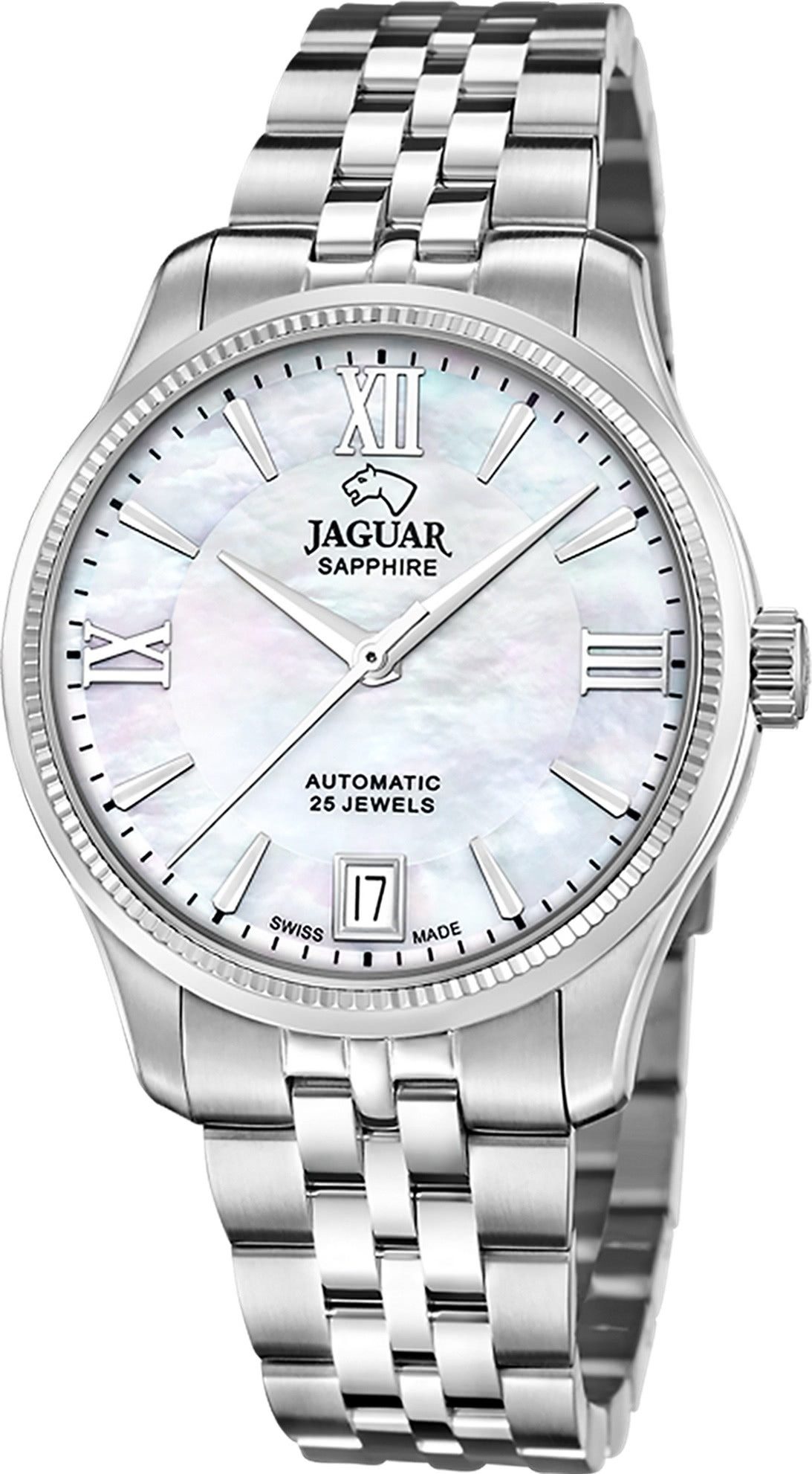 Die Luxus Elegant Uhr der Marke Jaguar hat ein schönes Armband aus Edelstahl in silber mit Butterfly-Faltschließe. Eine Uhr aus der Jaguar Heritage Kollektion für Damen in der Gehäusefarbe silber mit . Die Analoguhr mit Saphirglas hat ein Zifferblatt in der Farbe weiß perlmutt. Die Form der Uhr ist rund und das Gehäuse ist mittel ca. 34mm.