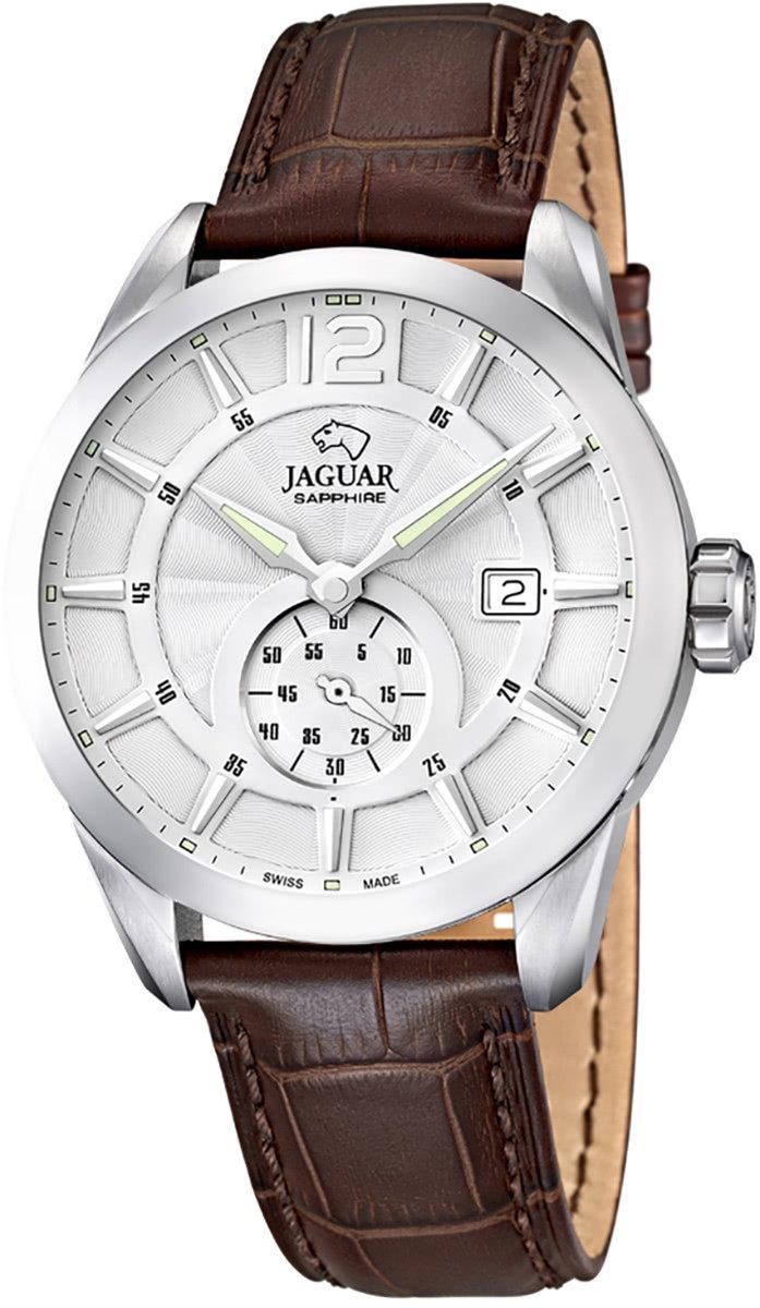 Die Elegant Uhr der Marke Jaguar hat ein schönes Armband aus Leder in braun mit Klappverschluss. Eine Uhr aus der Jaguar ACM Kollektion für Herren in der Gehäusefarbe silber mit Quarzwerk. Die Analoguhr mit Saphirglas hat ein Zifferblatt in der Farbe silber. Die Form der Uhr ist rund und das Gehäuse ist groß ca. 43mm.