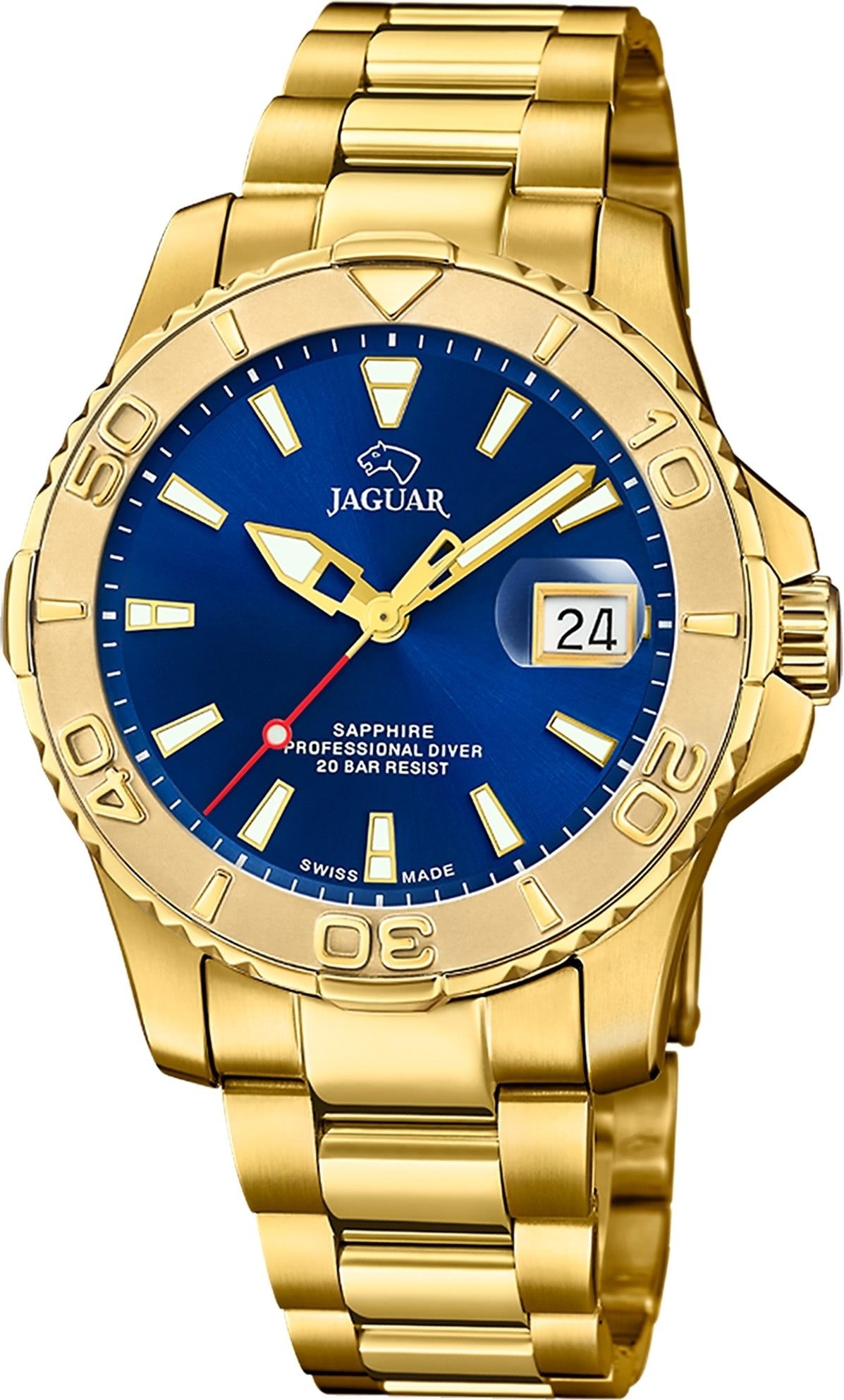 Die Elegant Uhr der Marke Jaguar hat ein schönes Armband aus Edelstahl in gold mit Faltschließe. Eine Uhr aus der Jaguar Pro Diver Kollektion für Herren in der Gehäusefarbe gold mit Quarzwerk. Die Analoguhr mit Saphirglas hat ein Zifferblatt in der Farbe blau. Die Form der Uhr ist rund und das Gehäuse ist groß ca. 40mm.