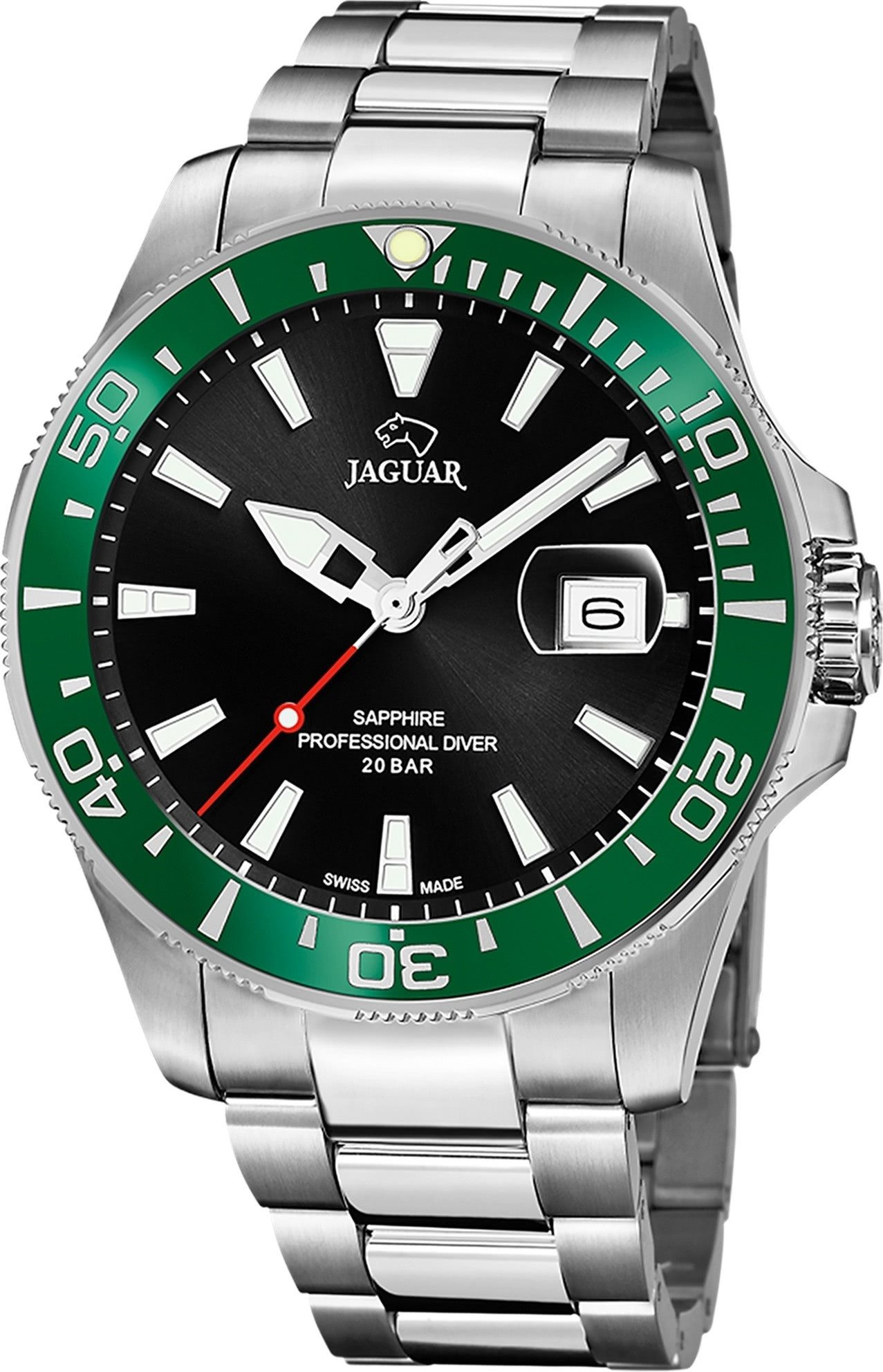 Die Luxus Uhr der Marke Jaguar hat ein schönes Armband aus Edelstahl in silber mit Faltschließe. Eine Uhr aus der Jaguar Pro Diver Kollektion für Herren in der Gehäusefarbe silber grün mit Quarzwerk. Die Analoguhr mit Saphirglas hat ein Zifferblatt in der Farbe schwarz. Die Form der Uhr ist rund und das Gehäuse ist groß ca. 43,5mm.