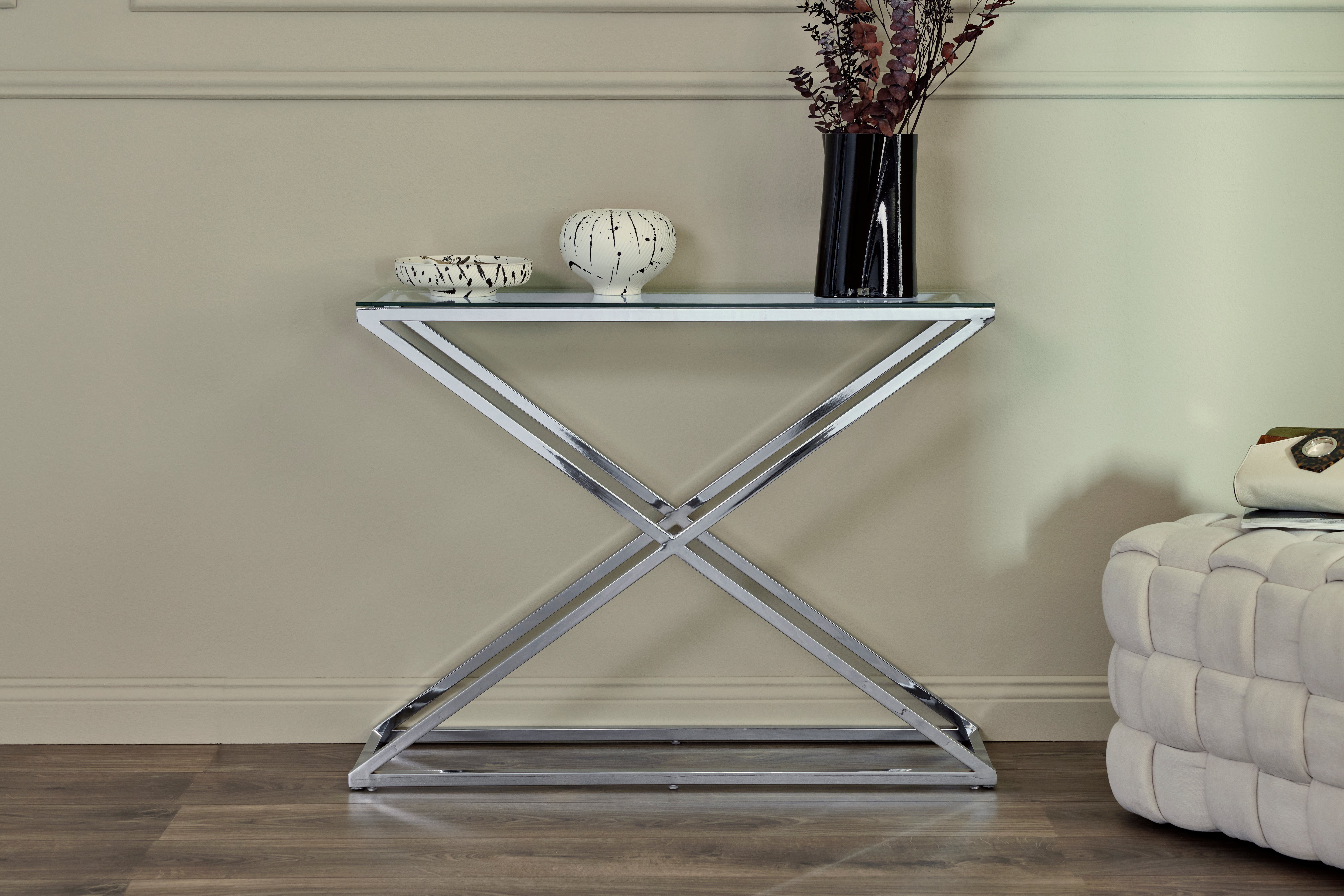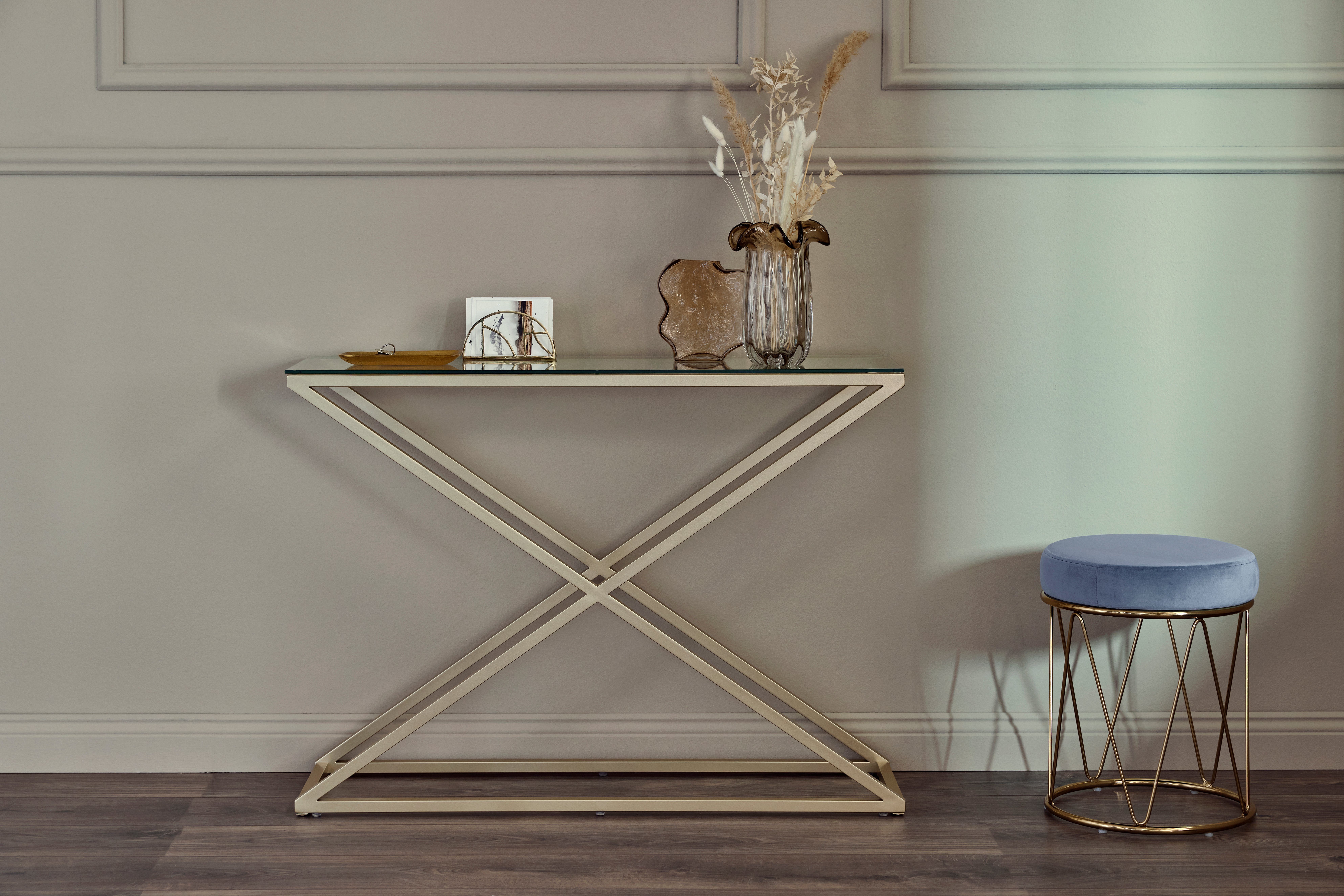 Um den eleganten Stil des Konsolentischs zu ergänzen, eignen sich beispielsweise dunkle Hölzer und Materialien wie Messing, Kupfer oder Gold. Sie unterstreichen das glamouröse Design und sorgen für eine nobles Ambiente in deiner Einrichtung.
