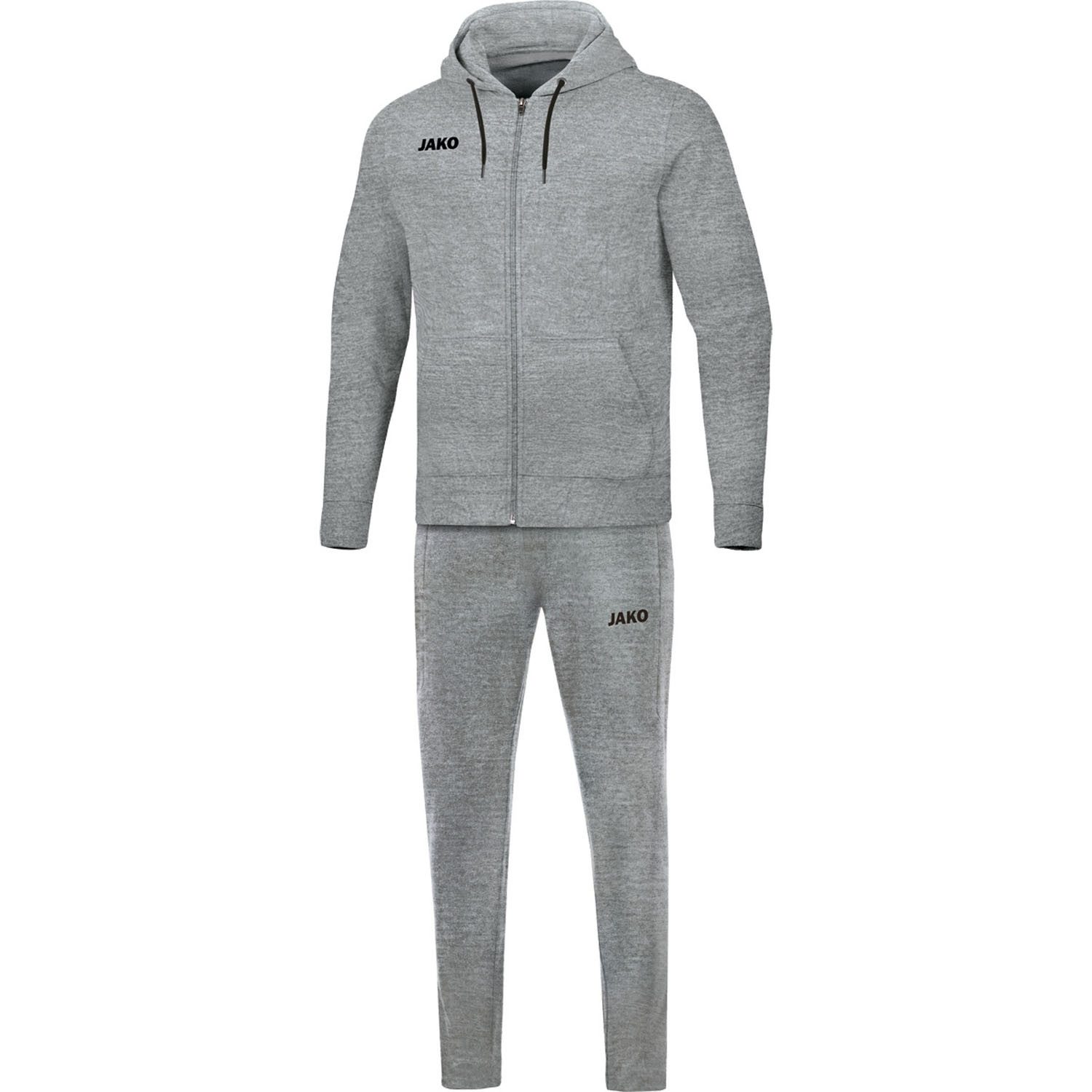 Jako Herren Jogginganzug Base mit Kapuze. Bestehend aus der Kapuzenjacke BASE und der Jogginghose BASE ist der Jogginganzug BASE mit Kapuze dein idealer Begleiter beim Sport. Jacke: Weicher Griff - Einlaufvorbehandelt - Aufgesetzte Taschen - Kapuze mit Kordelzug - Kordeln in Kontrastfarbe - Jacken- und Ärmelabschluss mit Ripp. Hose: Weicher Griff - Einlaufvorbehandelt - Seitentaschen mit Reißverschluss - Kordeln in Kontrastfarbe - Elastischer Bund mit Kordelzug. Material (-01/-04/-08/-09/-21): 70% Baumwolle, 30% Polyester. Material (-41): 60% Baumwolle, 30% Polyester, 10% Viskose.
