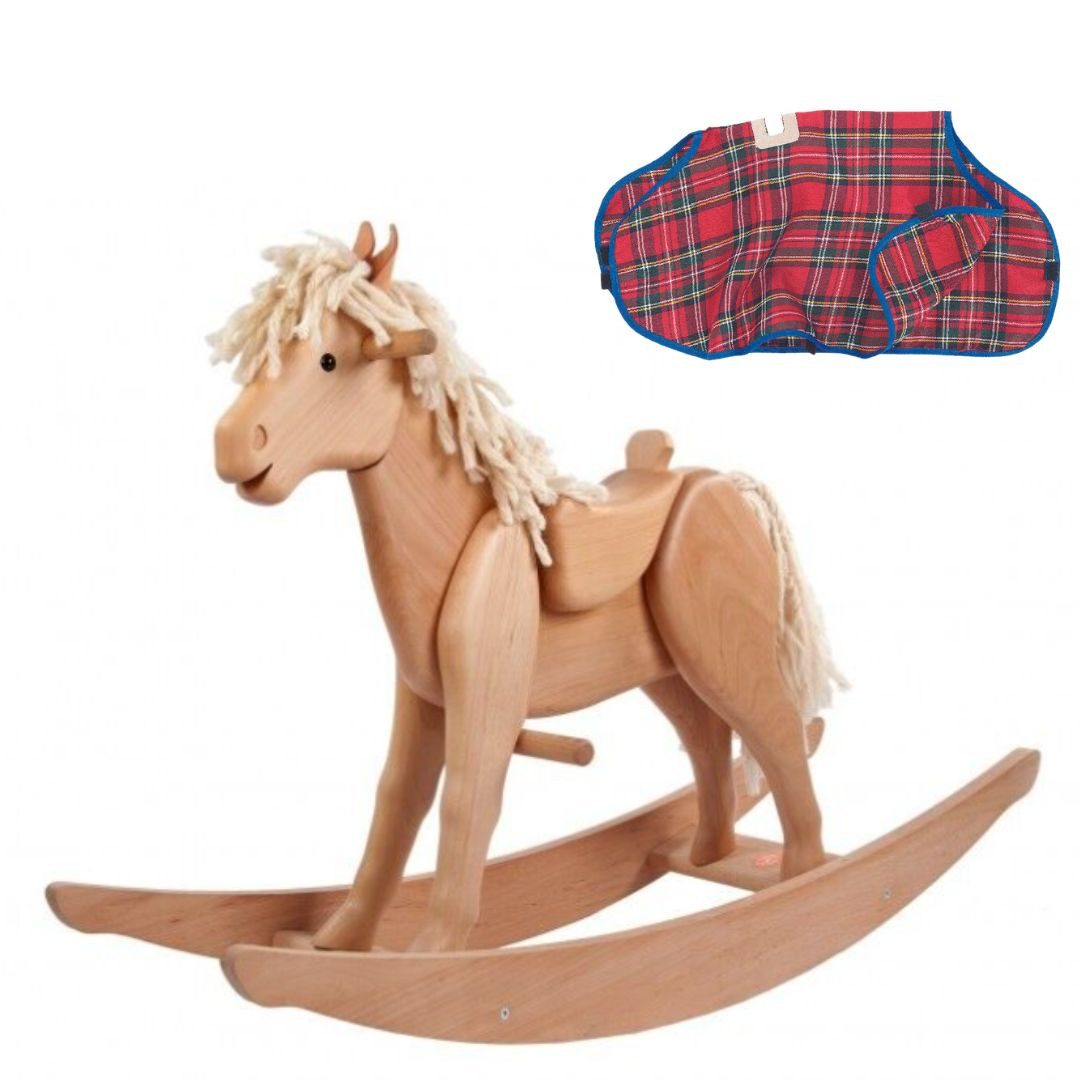 Jolly – das schönste Schaukelpferd der Welt, mit passender Pferdedecke im Set Jolly ist ein liebevoll gestaltetes, großes Schaukelpferd mit ausdrucksstarkem Gesicht und authentisch geformtem Körper. Aus 100 % gedämpftem Buchenholz gefertigt, wurde es mit dem Deutschen Designpreis für Holzspielzeug ausgezeichnet und gilt bis heute als das schönste Schaukelpferd der Welt. Geeignet ist es für Kinder ab 1 Jahr (sofern sie bereits selbstständig sitzen können) bis etwa 6 Jahre. Für zusätzliche Sicherheit gibt es einen optionalen Sicherheitsbügel – ideal auch für kleine Reiter ab 10 Monaten. Als besonderes Zubehör ist eine klassische, handgefertigte Pferdedecke im rot-karierten Design erhältlich – sie rundet das Spielset perfekt ab. Mit wenigen Handgriffen kann das Kind die Decke selbst am Pferd befestigen. Der Klettverschluss am Bauch sowie der lederverstärkte Schlitz zur Halfterung machen das Anlegen besonders einfach. So bleibt Jolly nachts schön warm auf der „Kinderzimmerweide“ – ein liebevolles Detail, das nicht nur für Spielspaß sorgt, sondern auch das Zubettgeh-Ritual des Kindes begleitet. Ob ausreiten oder einkuscheln – mit Jolly und seiner Pferdedecke wird das Spiel rund ums Pferd lebendig und pädagogisch wertvoll zugleich.