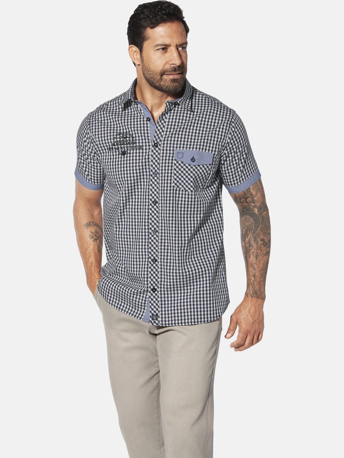 Das Kurzarmhemd GHOTIN von JAN VANDERSTORM peppt jeden Kleiderschrank mit echt kernigem Charme auf. Mit seinem kessen Karomuster und dem starken Print auf der Brust zieht es garantiert Blicke auf sich. Der lässige Kentkragen und die farblich abgesetzten Ärmelabschlüsse verleihen ihm eine extra Portion Stil. Das Hemd mit Klappentasche auf der Brust ist ein klasse Partner für lockere Jeans oder legere Shorts – perfekt für alle Männer, die es gern unkompliziert haben. Also, packen Sie das Kurzarmhemd GHOTIN in Ihren Schrank und zeigen Sie, dass Sie Geschmack haben!
