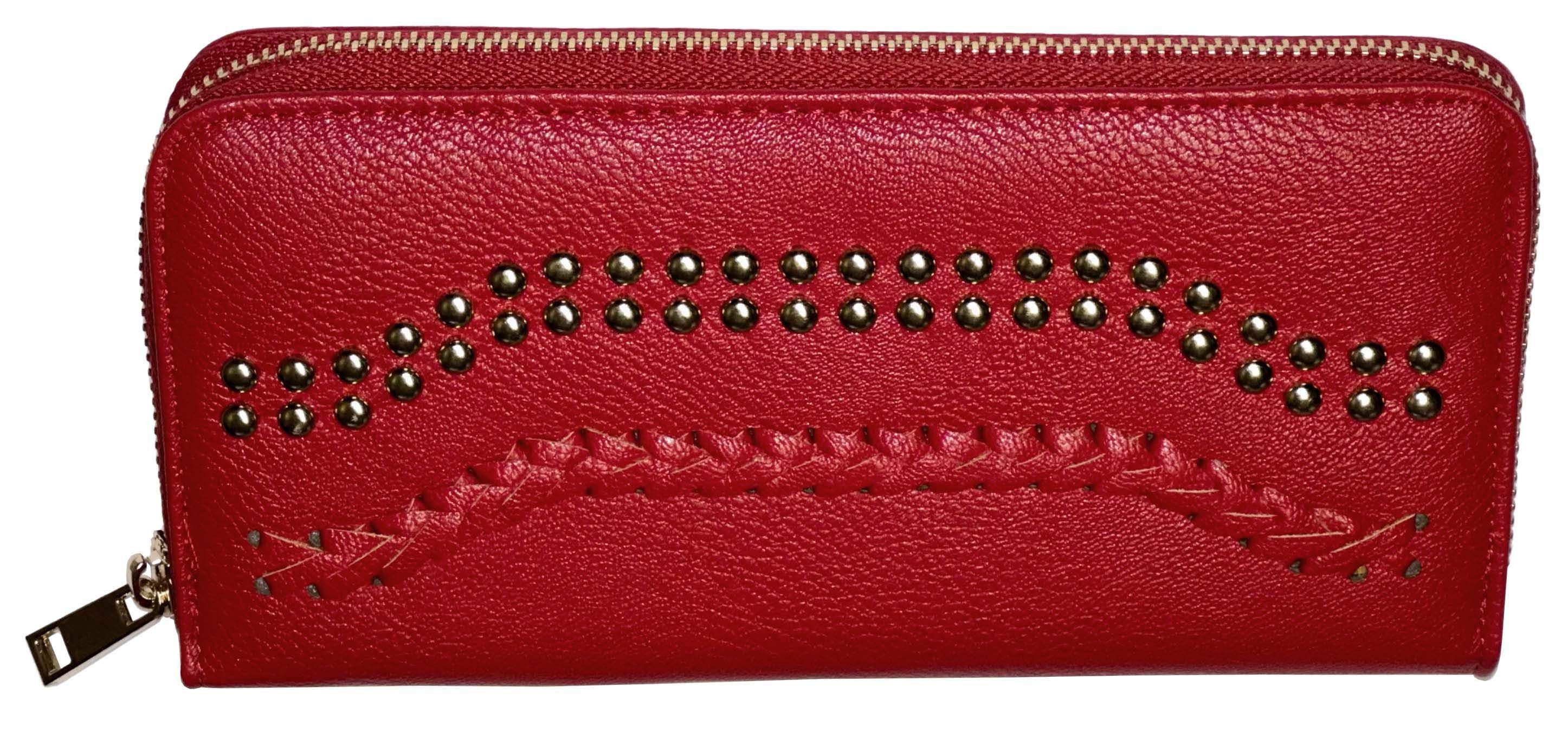 Stylisches Design: Der Trendlook mit 44 goldfarbenen Nieten und einem eleganten Flechteinsatz auf der Vorderseite macht diese Geldbörse zu einem modischen Accessoire.