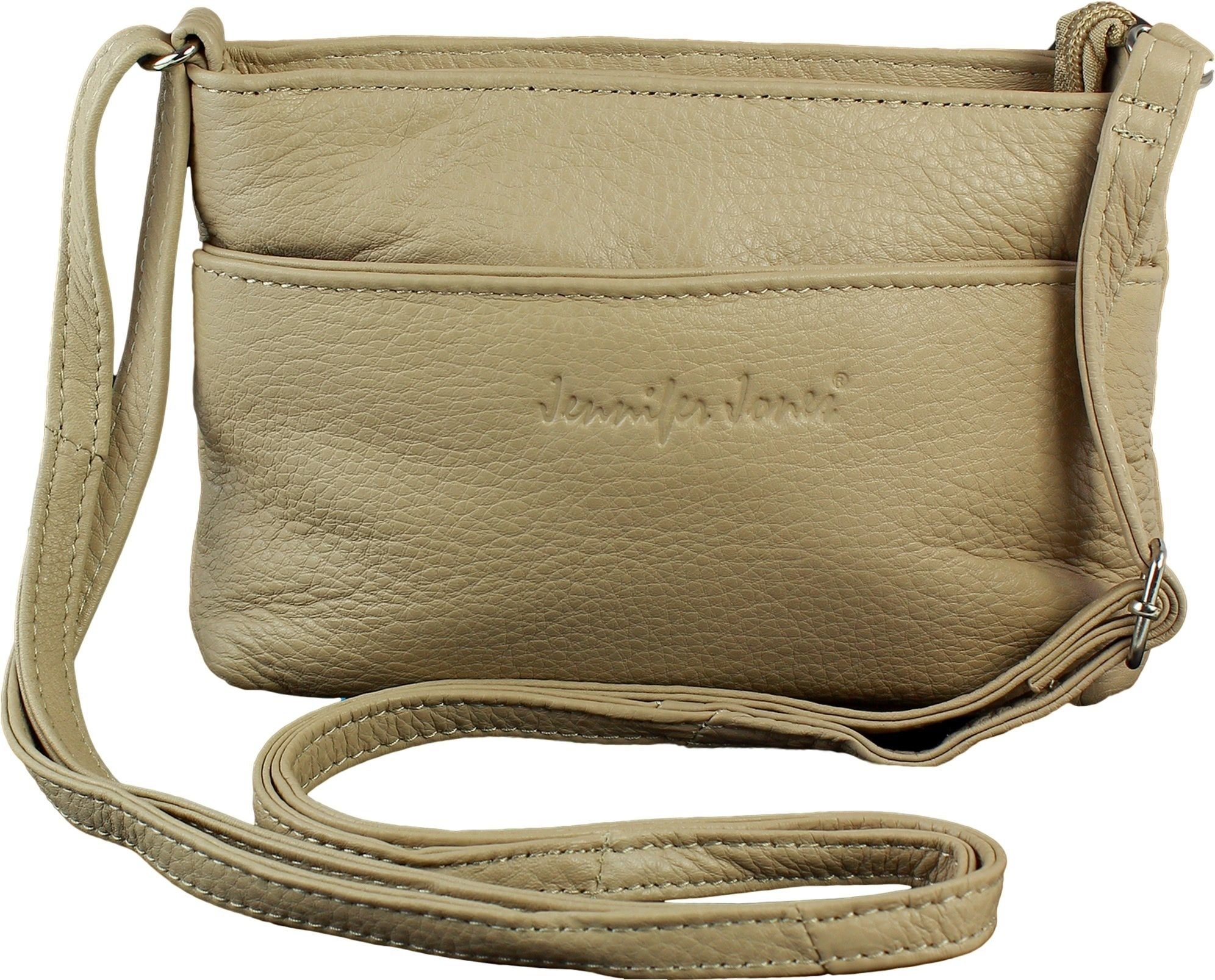 Eine modische Umhängetasche für Damen der Marke Jennifer Jones in der Farbe beige. Diese elegante Tasche aus Leder mit den Maßen 21,5cm x 4cm x 14cm hat die Bestellnummer.