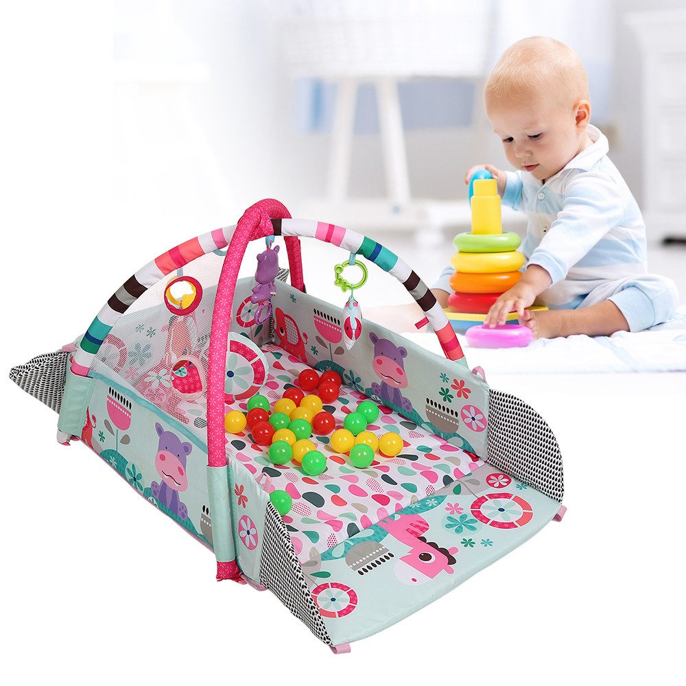 3-IN-1-SET: Unsere Designermatte kann auf verschiedene Weise verwendet werden. Sie können die Matte entweder flach hinlegen und die beiden Bögen zum Aufhängen der Spielsachen montieren oder die Kanten der Matte verbinden, so dass Ihr Kind von allen Seiten geschützt ist. Die Unterlage kann auch als Krabbeldecke verwendet werden.