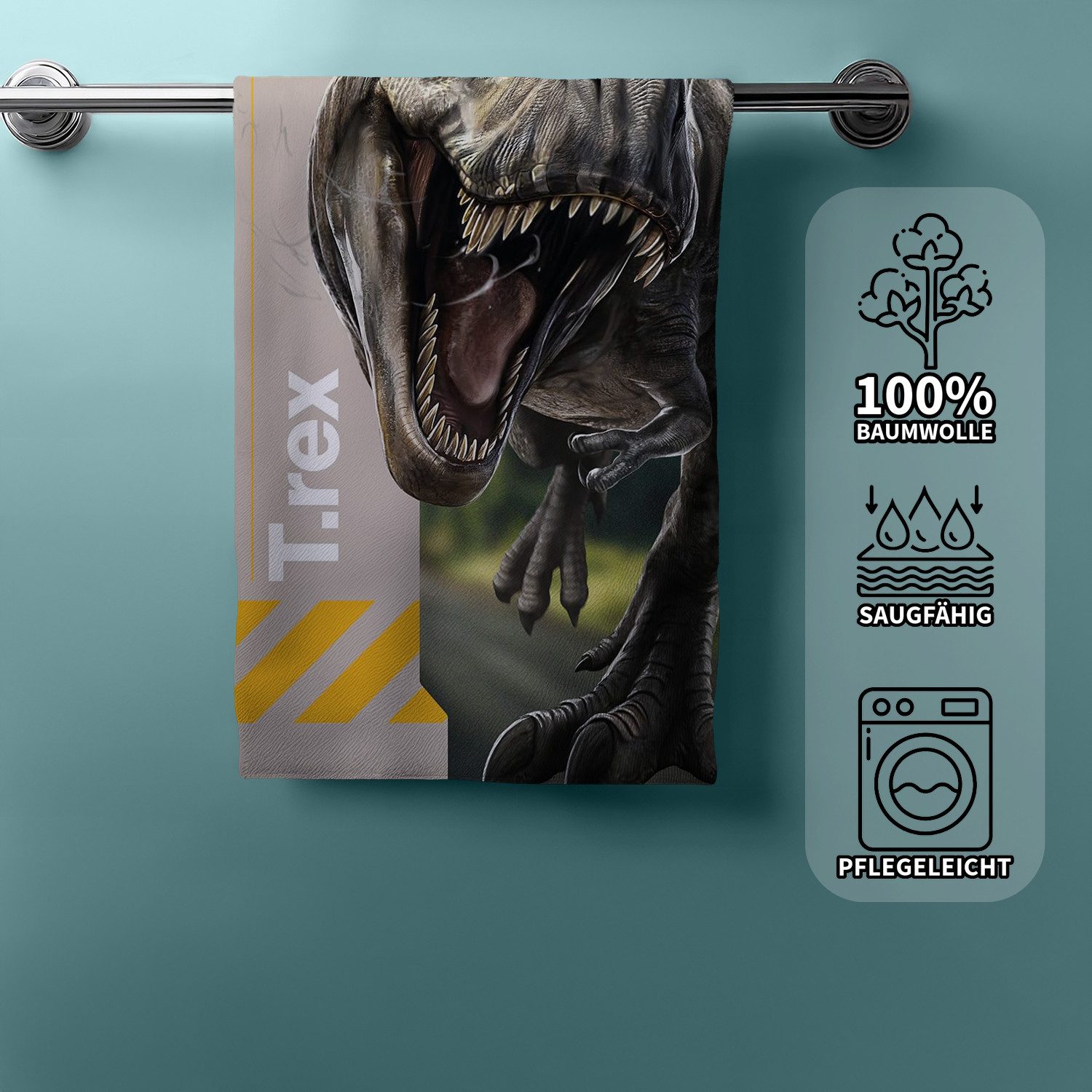 Bereit für ein prähistorisches Abenteuer? Mit diesem beeindruckenden Jurassic World Duschtuch tauchst du direkt ein in die Welt der Giganten! Das Handtuch zeigt einen furchterregenden Tyrannosaurus Rex, der wild brüllt.