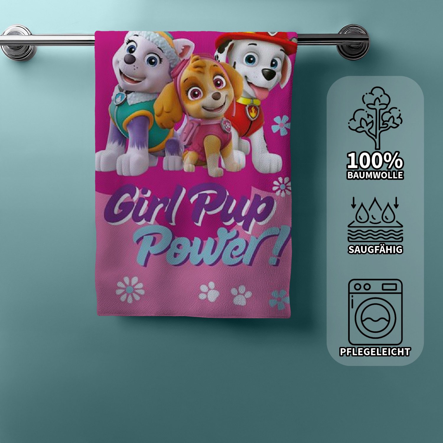 Das lebendige Design mit den beliebten Paw Patrol Heldinnen Skye und Everest sowie dem Feuerwehrhund Marshall auf einem fröhlich pinken Hintergrund mit Pfotenabdrücken und Blümchen bringt Kinderaugen zum Leuchten und macht das Duschtuch zum Hingucker im Badezimmer, am Strand oder im Schwimmbad.