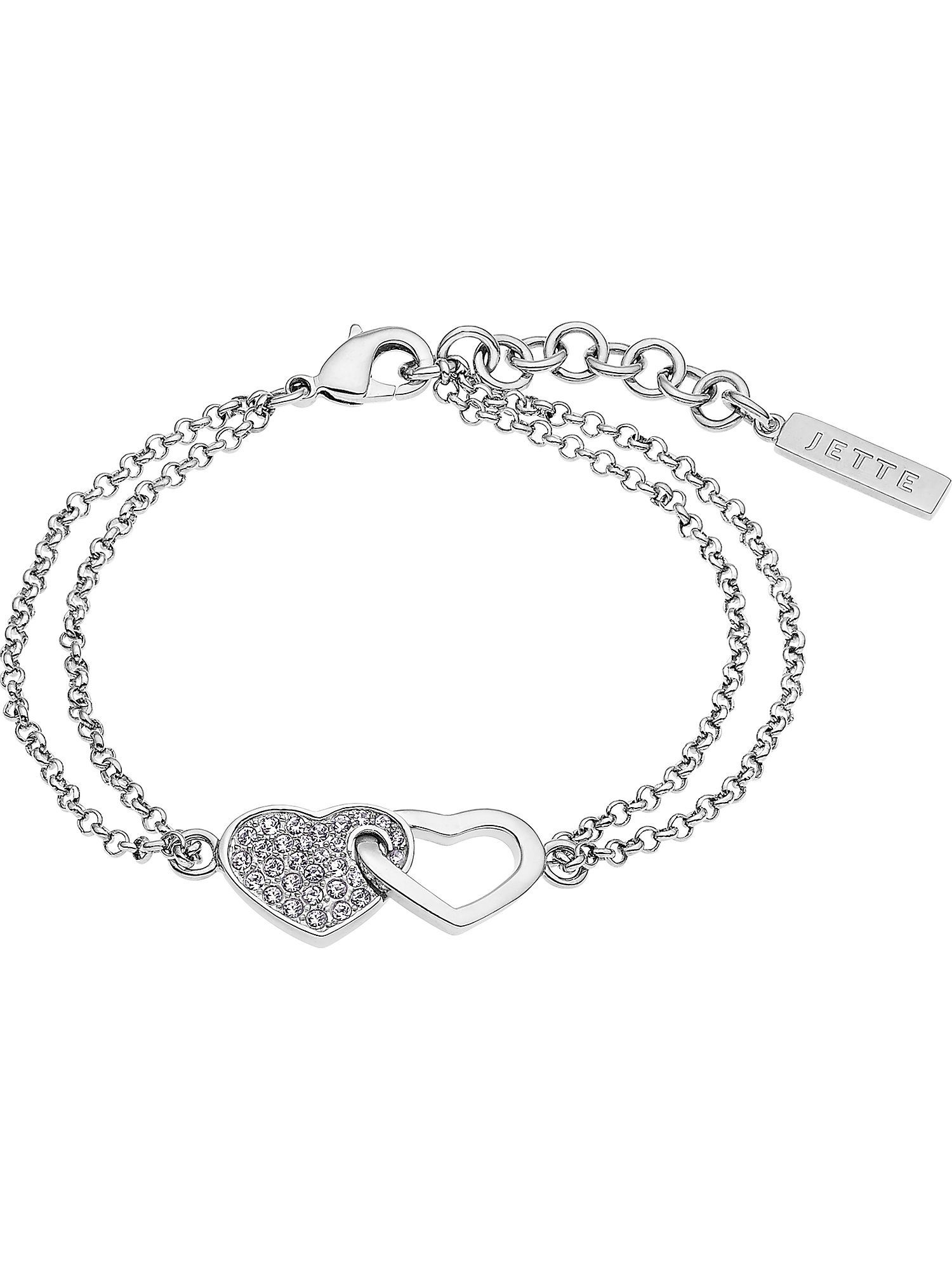 Herzerfrischend simpel und dennoch märchenhaft schön zeigt sich dieses Armband aus dem Hause JETTE. Das doppelt geführte Kettchen aus poliertem Silber umfängt 2 Anhänger in Herzform. Einer von ihnen ist auf und auf mit funkelnden Zirkonia-Steinchen besetzt. Dieses edle Schmuckstück repräsentiert das ideale Liebespfand und ist als Geschenk, das von Herzen kommt, niemals verkehrt. Es trägt sich stilvoll allein oder kombiniert mit einer sportlichen Armbanduhr.