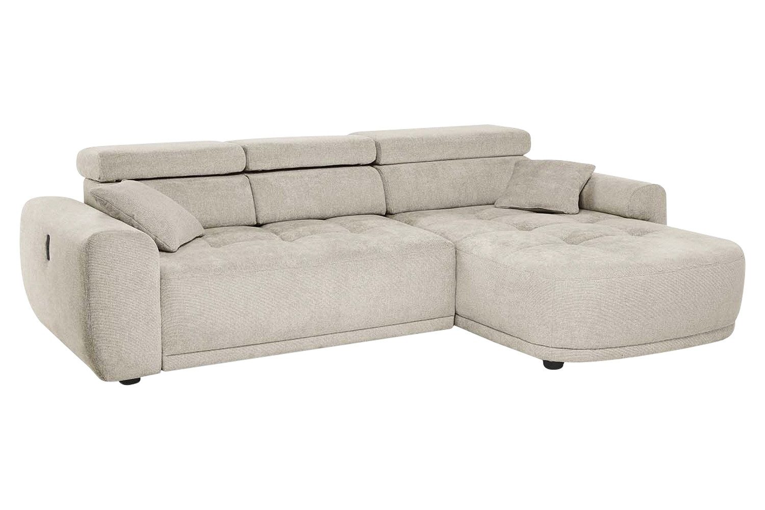 Lieferumfang | 1 Ecksofa mit rechts- oder linksseitig montierbarer Ottomane, elektrischer Sitztiefenverstellung, 3 Kopfteilverstellungen und 2 Zierkissen |