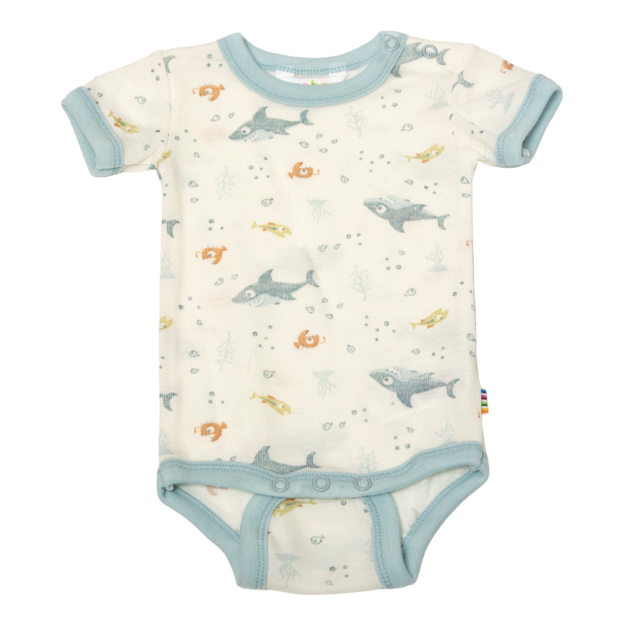 Der hellblaue Joha Kurzarmbody für Jungen ist aus 100 % Merinowolle gefertigt und bietet optimalen Komfort in jeder Jahreszeit. Mit einem entzückenden Unterwasser-Design ist er ein visuelles Highlight, das zum Träumen einlädt. Die Merinowolle sorgt für Elastizität und eine perfekte Passform, während die Druckknöpfe das An- und Ausziehen erleichtern. Die Qualität des Bodys bleibt auch nach häufigem Waschen bestehen, was ihn zu einem praktischen und langlebigen Kleidungsstück für den Alltag macht.