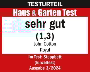 Das John Cotton Royal erzielt im Einzeltest des Magazins „Haus & Garten Test“ das Gesamtergebnis „sehr gut (1,3)“. Das Steppbett hat eine hervorragende Funktion: Es ermöglicht ein „behagliches“ Bettklima und hat eine „hohe“ Bauschkraft“. Der Bezug trocknet nach dem Waschen „sehr schnell“ und das Überziehen ist einfach. Außerdem ist das Steppbett hervorragend verarbeitet. Insgesamt ermöglicht es einen „erholsamen Schlaf“.
