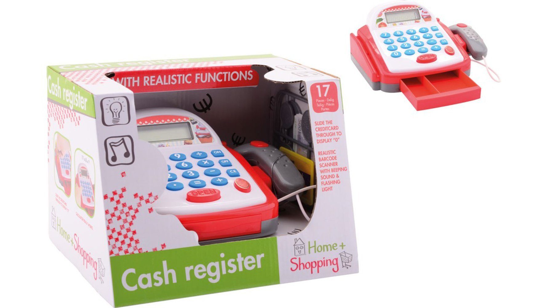 Bezahlen Sie Ihre Einkäufe mit dieser Registrierkasse mit Licht und Ton weiß/rot von Johntoy. Scannen Sie die Produkte mit dem realistischen Barcode-Scanner, der echten Ton und Licht liefert. Mit dem großen, roten Druckknopf öffnen Sie die Kassenschublade. Die mitgelieferte Kreditkarte können Sie bequem durch den Schlitz der Kasse ziehen. Außerdem sind Münzen und Scheine dabei.