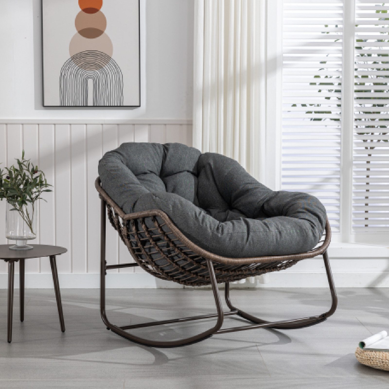 Lassen Sie sich von unserem einzigartigen Ei-Form-Schaukelstuhl verzaubern, der die Schönheit natürlicher Materialien mit moderner Stabilität kombiniert. Der hochwertige Stahlrahmen ist nicht nur langlebig, sondern auch elegant konstruiert und macht in jedem Raum oder Garten eine gute Figur. Der Schaukelstuhl ist ergonomisch so geformt, dass er perfekt passt und eine entspannte Sitzposition fördert. Ob im Wohnzimmer, auf der Terrasse oder im Freien, dieser Schaukelstuhl erfüllt eine Vielzahl von Bedürfnissen und ist der perfekte Ort zum Entspannen und Genießen.