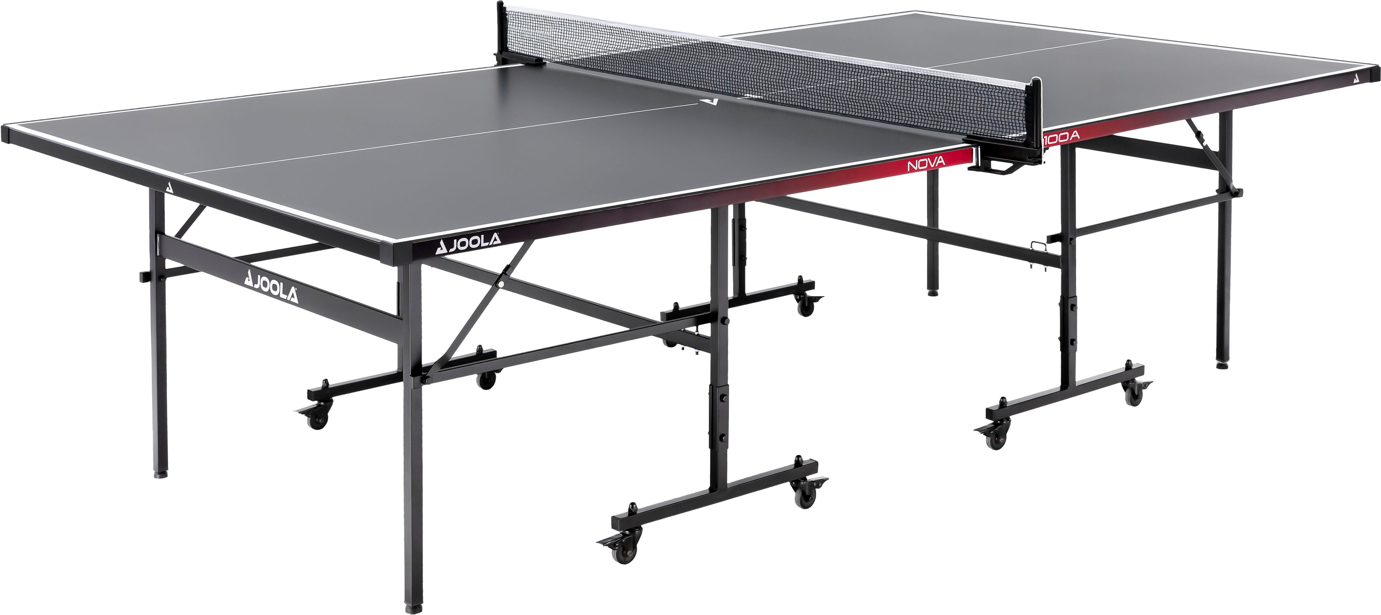 JOOLA Nova 100A Outdoor Tischtennisplatte - Modernes Design trifft auf herausragendes Spielverhalten Die JOOLA Nova 100A Outdoor Tischtennisplatte ist mit praktischen Funktionen ausgestattet, die sie zum idealen Tischtennistisch für den Außenbereich machen. Mit ihrem auffälligen rot-schwarzen Farbverlauf kombiniert der Tisch hervorragende Spielleistung mit einem modernen und einzigartigen Design, das in jedem Garten oder auf jeder Terrasse garantiert alle Blicke auf sich zieht. Die 4 mm dicke Aluminium-Verbundmaterial-Oberfläche sorgt für einen gleichmäßigen Ballabsprung und exzellentes Spielverhalten. Egal, ob du mit Freunden spielst oder den Solo-Modus nutzt, indem du eine Tischhälfte hochklappst - dieser Tisch garantiert dir immer viel Spaß. Wichtige Fakten:4 mm dicke Aluminium-Verbund-Oberfläche: Bietet hervorragende Haltbarkeit und sorgt für einen gleichmäßigen Ballabsprung, der ein zuverlässiges Spielverhalten garantiert.Höhenverstellbare Tischbeine: Ermöglichen es dir, den Tisch schnell auszugleichen, sodass du immer eine perfekte Spielfläche hast - auch auf unebenem Boden.Transportsystem: Der Tisch ist mit 8 feststellbaren Rollen (ca. 5 cm Durchmesser) ausgestattet, die für einfache Handhabung und Flexibilität sorgen und gleichzeitig für Stabilität garantieren.Einfache Montage: Der Tisch lässt sich in nur 15 Minuten unkompliziert aufbauen, sodass du sofort losspielen kannst.Wetterfeste Netzgarnitur: Das mitgelieferte Netz ist wetterfest und macht den Tisch sofort einsatzbereit.Solo-Spielmodus: Eine Tischhälfte kann hochgeklappt werden, um das Solo-Spiel zu ermöglichen, was dir noch mehr Flexibilität beim Spielen bietet.Die JOOLA Nova 100A kombiniert hervorragende Spieleigenschaften mit modernem Design und bringt Stil sowie Funktionalität in deinen Garten, auf deine Terrasse oder in deinen Außenbereich. Egal, wo du spielst, dieser Tisch sorgt für stundenlangen Tischtennis-Spaß.