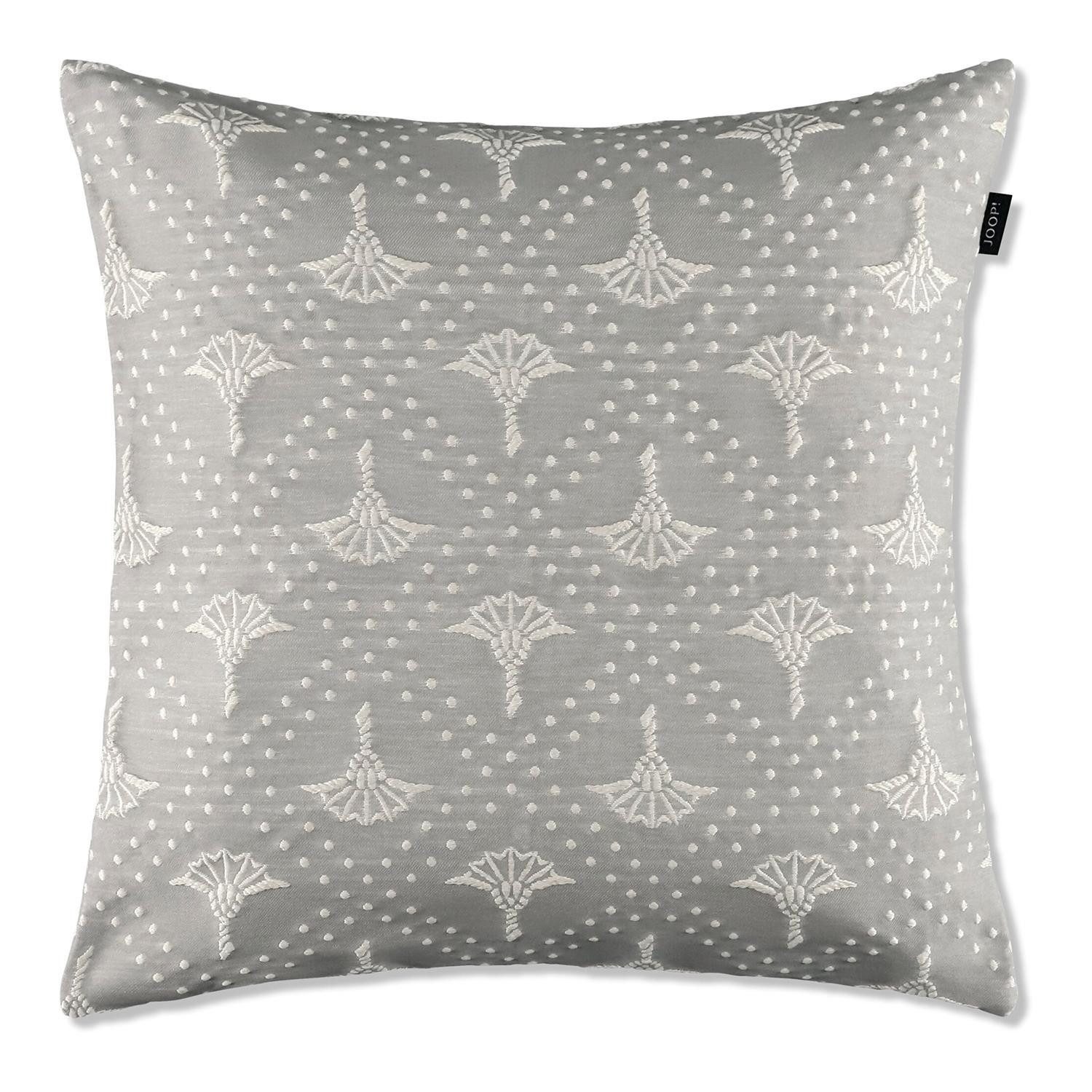 Die silbergraue Kissenhülle CORNFLOWER CHARM der Marke JOOP! misst 40 x 40 cm und besteht aus einem hochwertigen Mischgewebe aus Polyester und Baumwolle. Sie ist mit einem Reißverschluss ausgestattet, der ein einfaches Beziehen ermöglicht. Vorder- und Rückseite zeigen ein elegantes Logo-Muster in Jacquard-Qualität und sorgen für einen stilvollen Look. Die Kissenhülle wird als Einzelstück geliefert; das passende Inlett ist separat erhältlich. Ideal als dekoratives Wohnaccessoire für Sofa oder Bett.