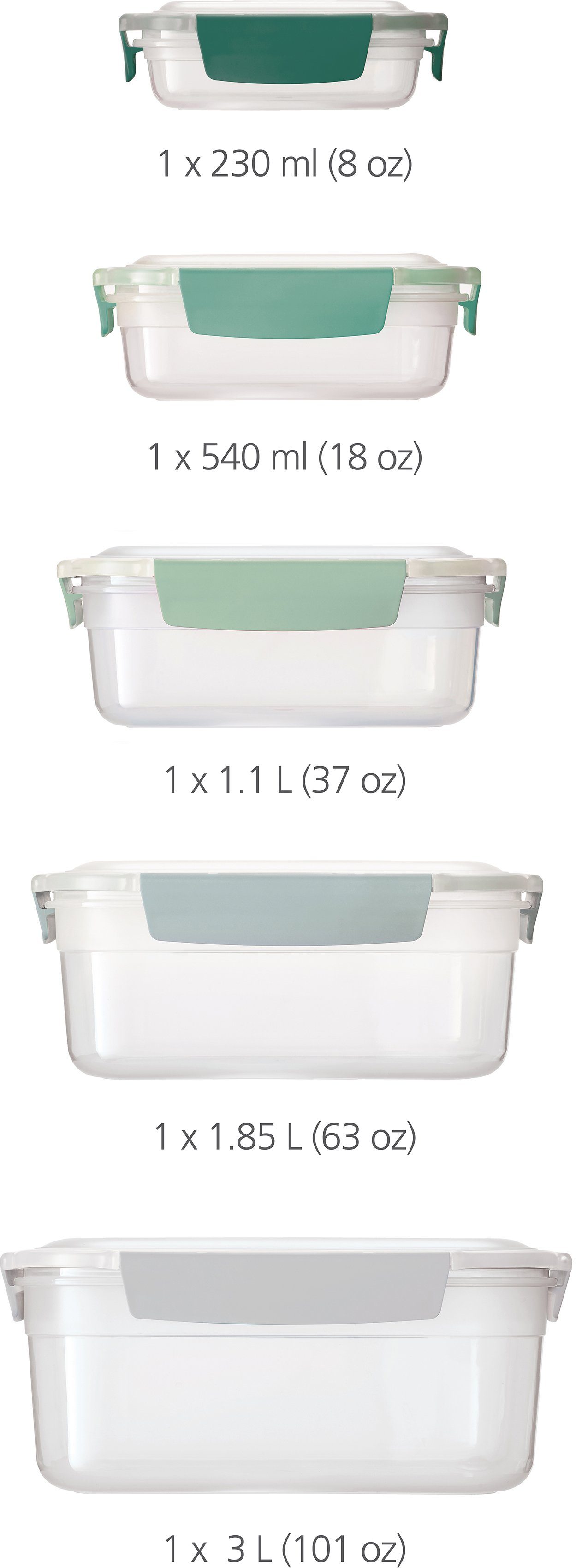 Lieferumfang | 1 x 230ml, 1 x 540ml, 1 x 1,1L, 1 x 1,85L, 1 x 3L Aufbewahrungsbehälter mit Deckeln |