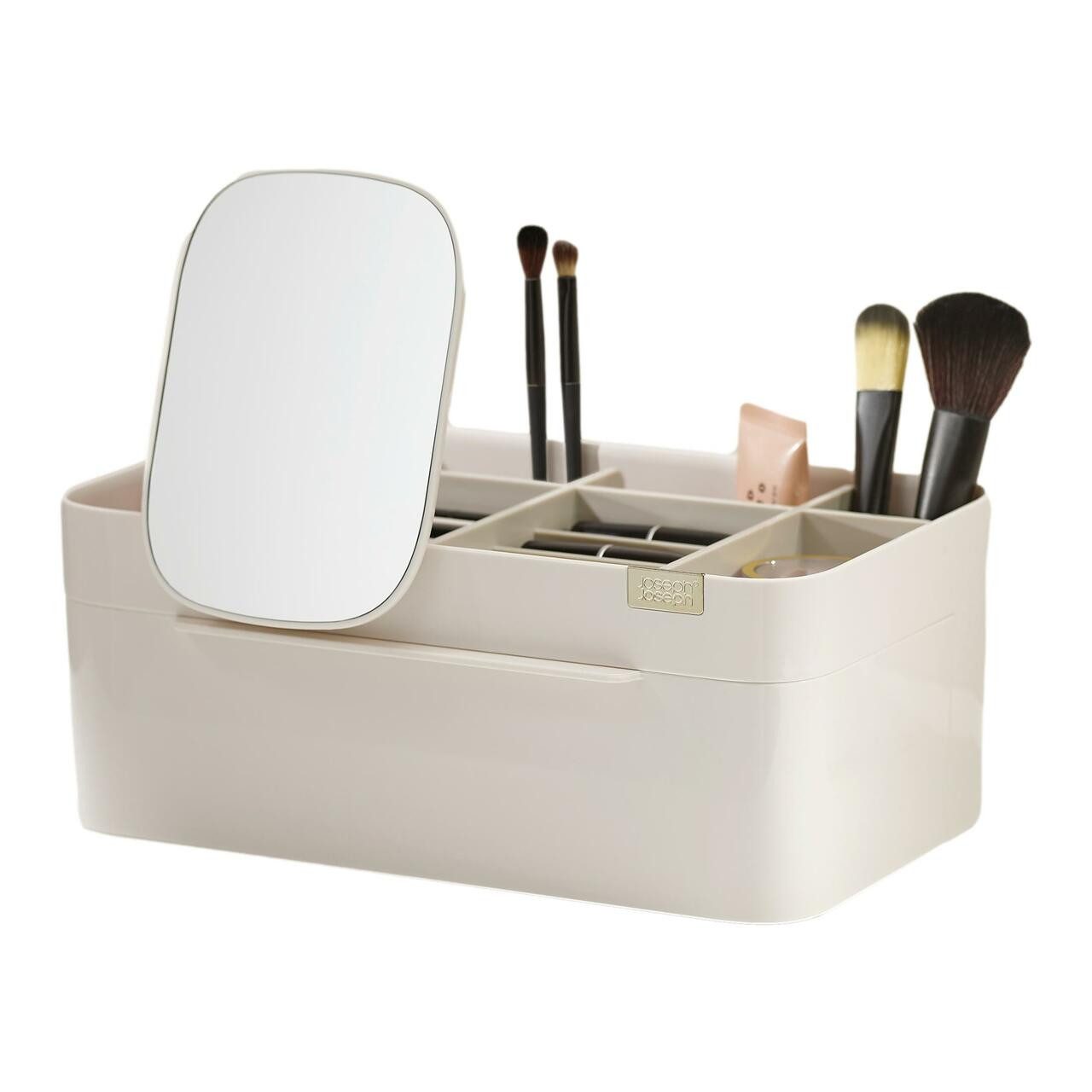Dieser Mehrzweck-Kosmetik-Organizer verfügt über verschiedene tiefe und flache Fächer, in denen sich verschiedene Gegenstände wie Make-up-Pinsel, Wimperntusche und Lidschatten unterbringen lassen. Dazu hat er eine große Schublade für Dinge wie Wattepads, Wattestäbchen oder Make-up-Schwämme. Die Schublade lässt sich mit einem kleinen Griff leicht öffnen und hat einen selbstführenden Magnetverschluss. Zum Organizer gehört auch ein abnehmbarer 2-in-1-Spiegel, den man in einem Fach an der Rückseite verstauen oder am Rand des Organizers anbringen kann, wenn man beide Hände frei haben möchte. Der Spiegel lässt sich in verschiedenen Winkeln anstellen. Auf der Rückseite hat er einen 3-fach-Vergrößerungsspiegel für die feinen Details. Das durch ein verchromtes Emblem abgerundete Design ist perfekt geeignet, um verschiedene Gegenstände aufzubewahren. Abmessungen: H12 x W30 x D19,5 cm. Aus folgenden Materialien zusammengesetzt: ABS 85.0%, Glass 14.0%, Magnets 0.5%, TPE 0.5%