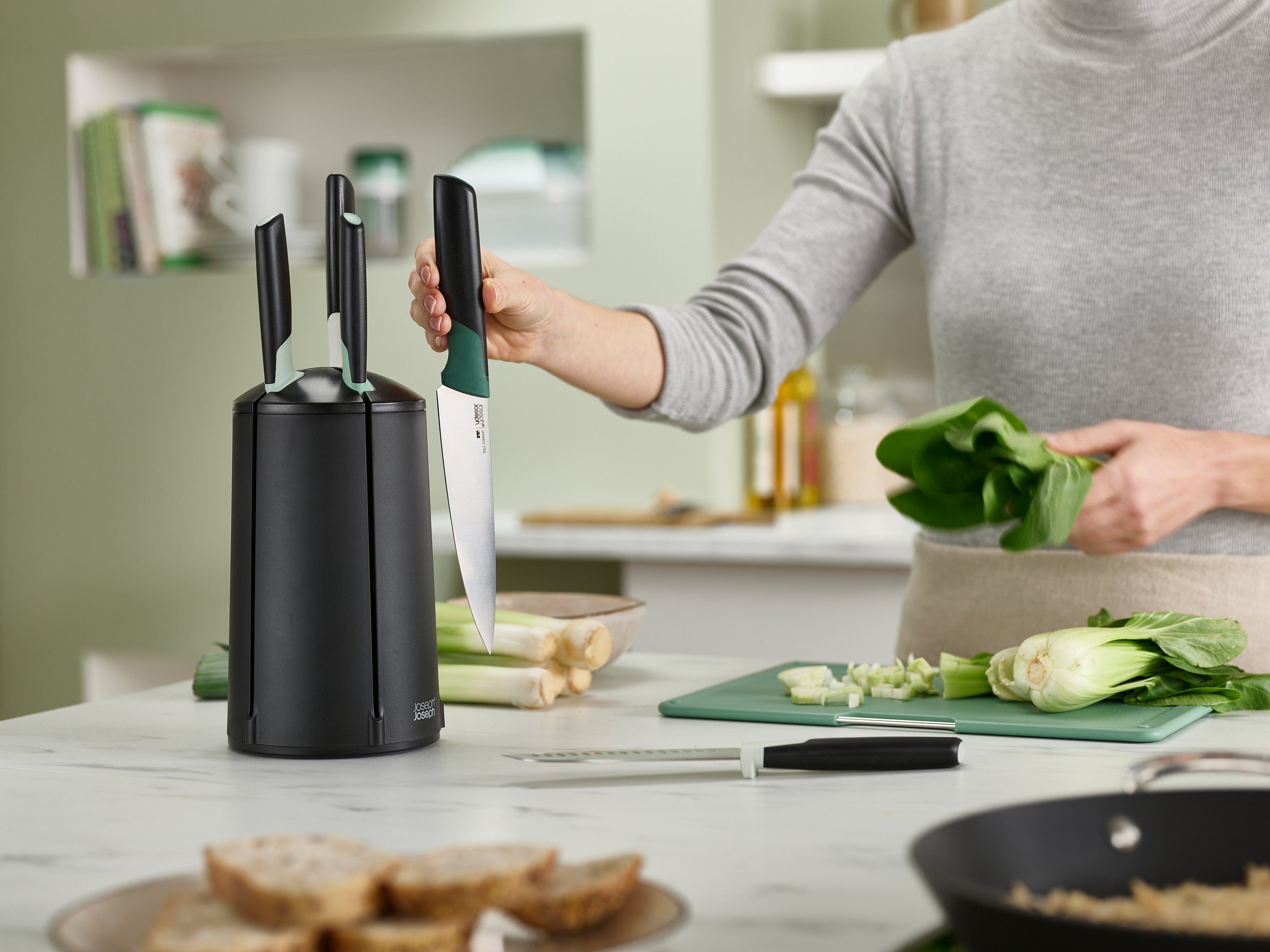 Drehbarer Messerblock mit seitlichen Schlitzen für einfachen Zugriff und rutschfester Basis